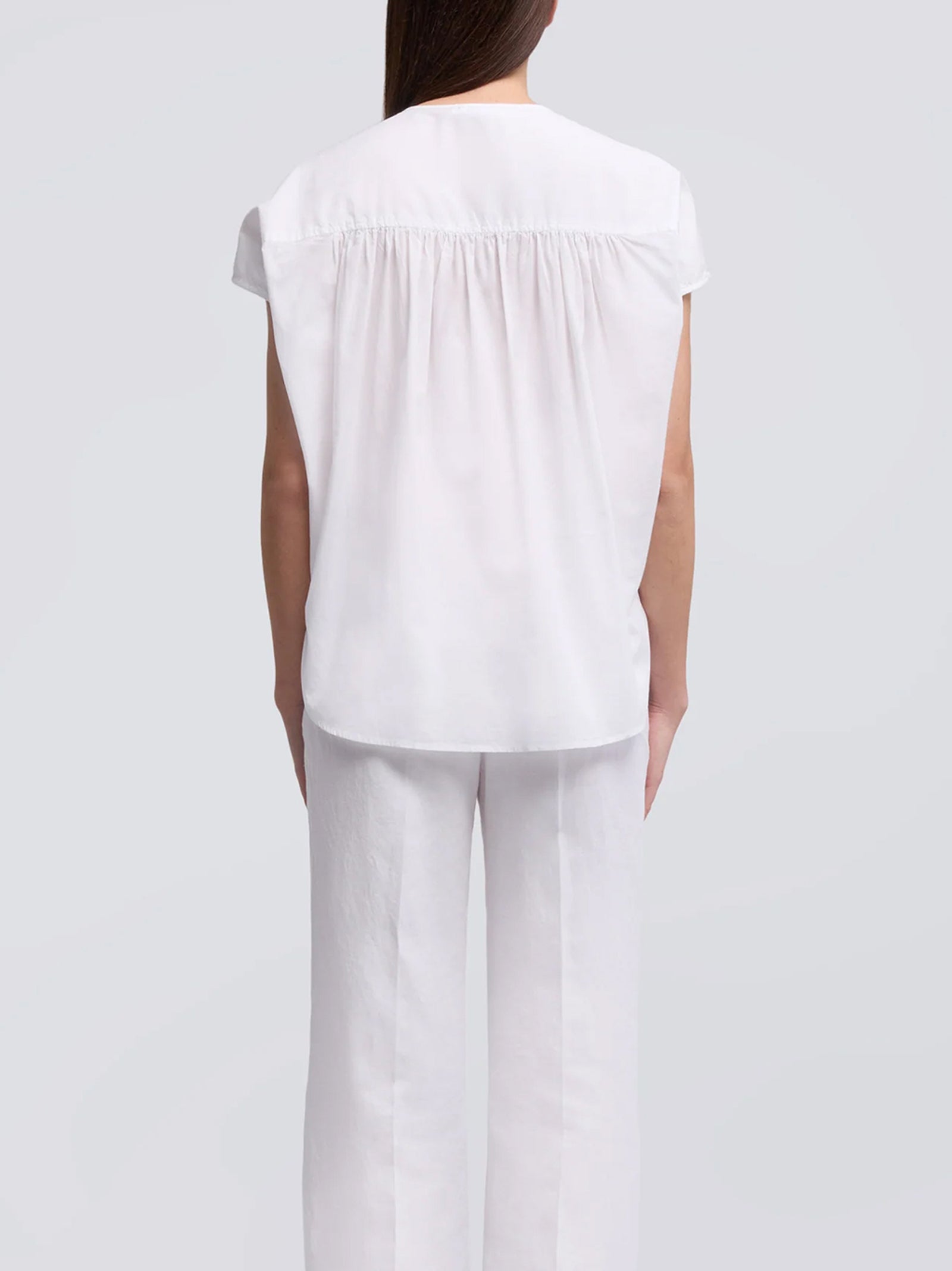 Camicia in mussola, scollo rotondo con fiocco, arricciature anteriori e posteriori, maniche scese senza manica, carre stondato posteriore, chiusura con bottoni, fondo stondato con spacchi, vestibilita regolare.
