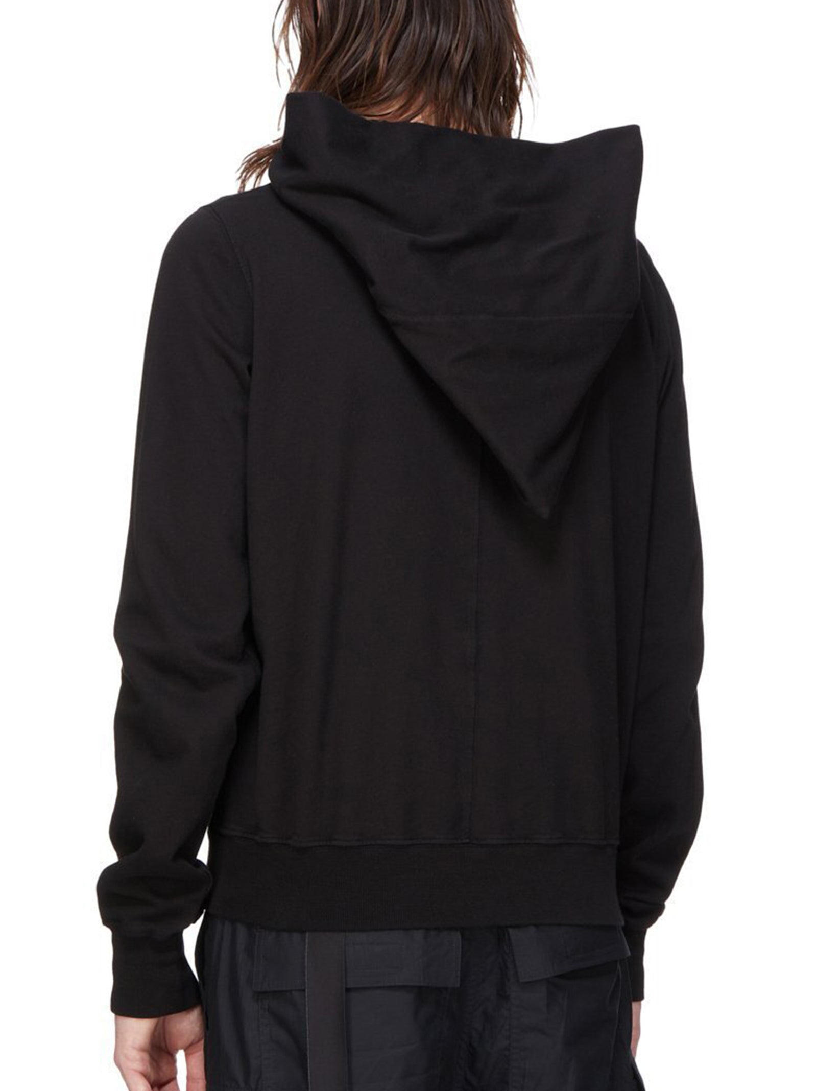 Felpa con cappuccio sopra i fianchi, zip asimmetrica curva, collo a imbuto e grande cappuccio appuntito. Dotata di tasche frontali, polsini e fondo a costine e cucitura posteriore centrale. Realizzata in jersey di cotone pesante, spazzolato e morbido, tinto in capo, in cotone biologico certificato.