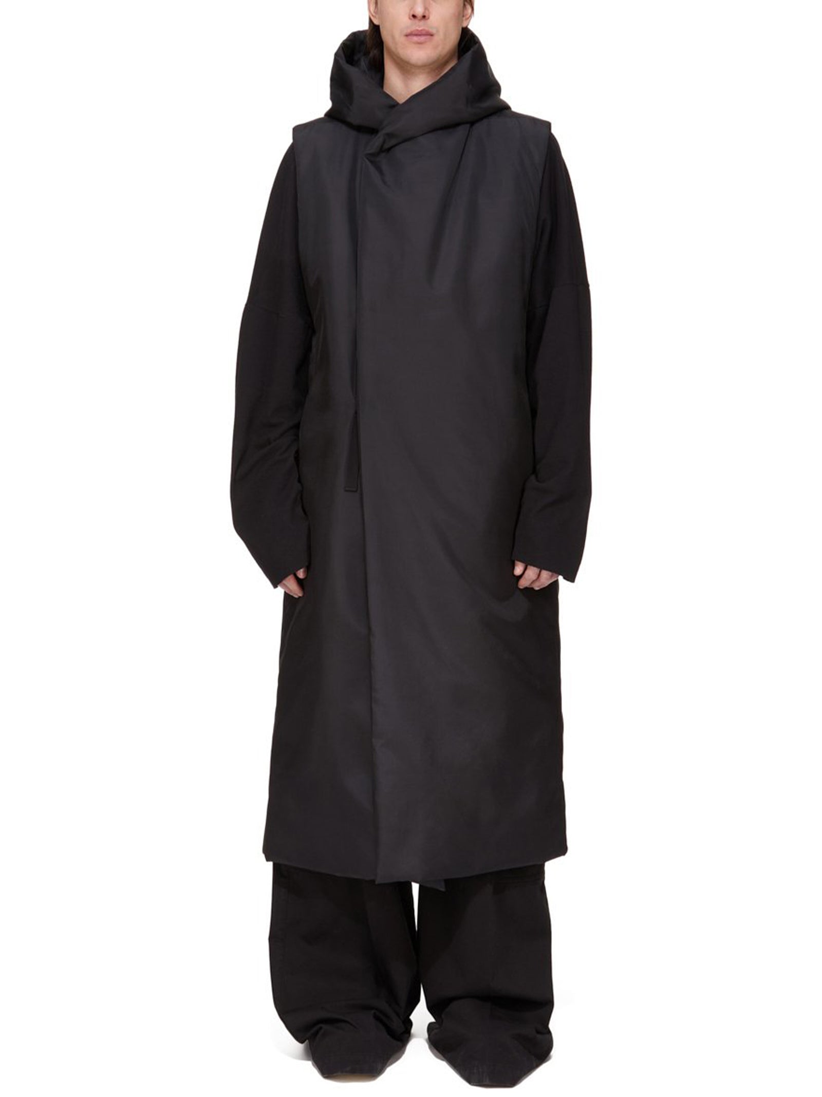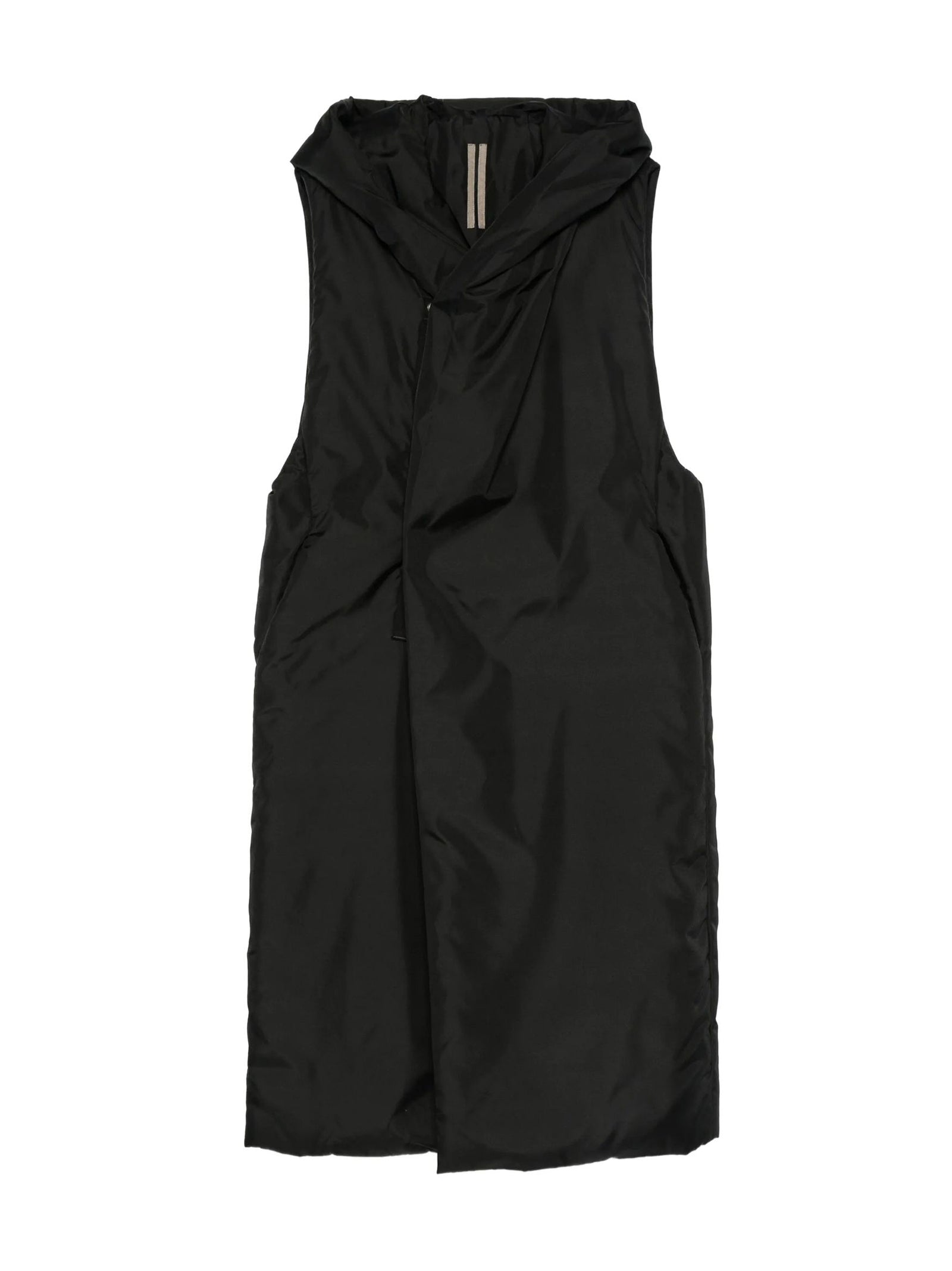 Hooded Liner lunghezza sotto il ginocchio, senza maniche, con chiusure a scatto nascoste, cappuccio, tasche laterali e cinturino posteriore in cotone. Foderato con imbottitura interna e due tasche con bottone. Realizzato in nylon canvas medio peso, morbido al tatto, in nylon riciclato certificato.