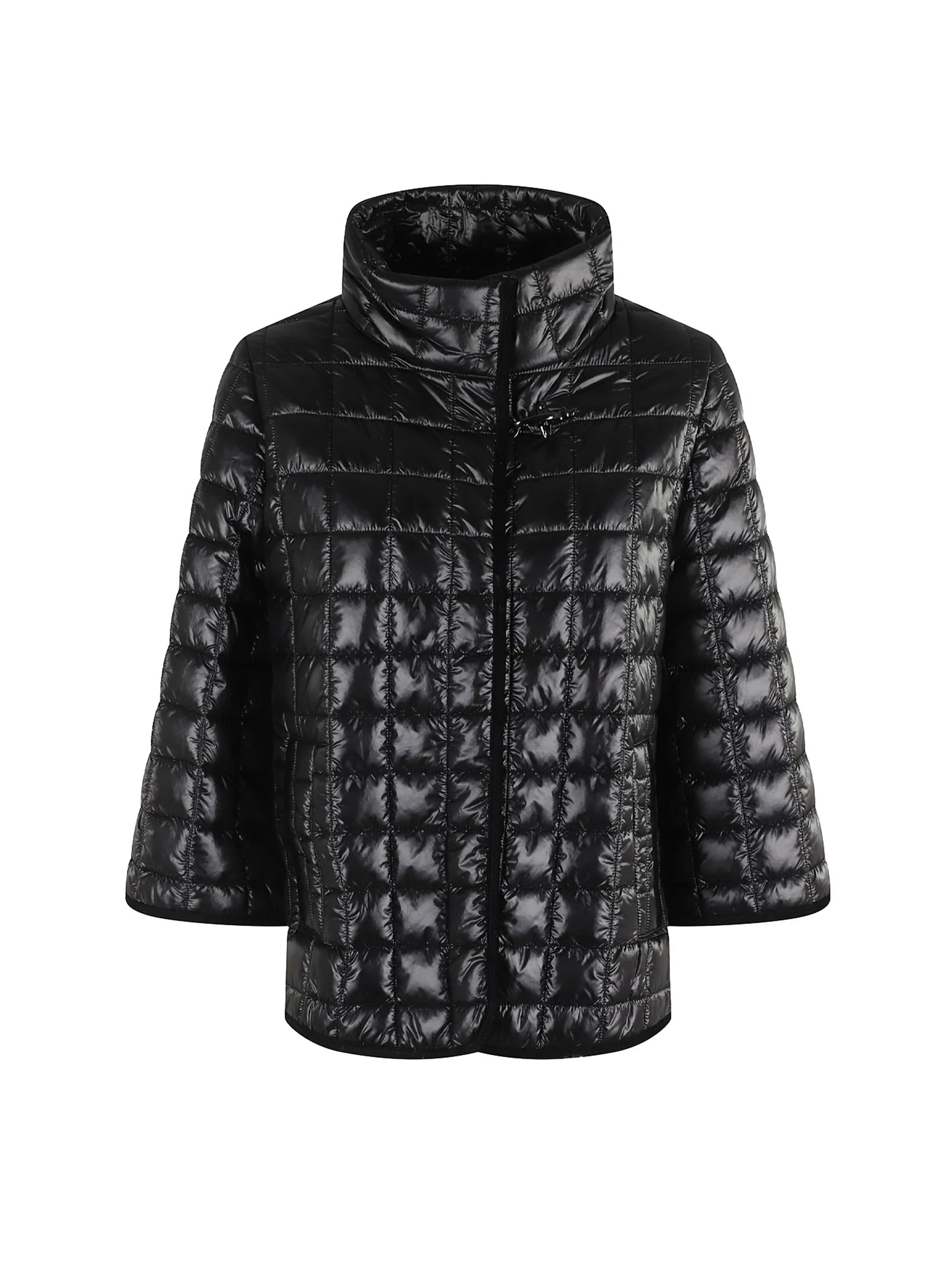 Cappa da donna in nylon lucido trapuntato con profili in velluto, tinta unita. Presenta maniche ampie a tre quarti, collo alto imbottito, chiusura con zip frontale e gancio metallico Fay, tasche laterali a filetto, cuciture impunturate e logo Fay sul gancio. Foderata, dalla vestibilità comoda e leggermente svasata.