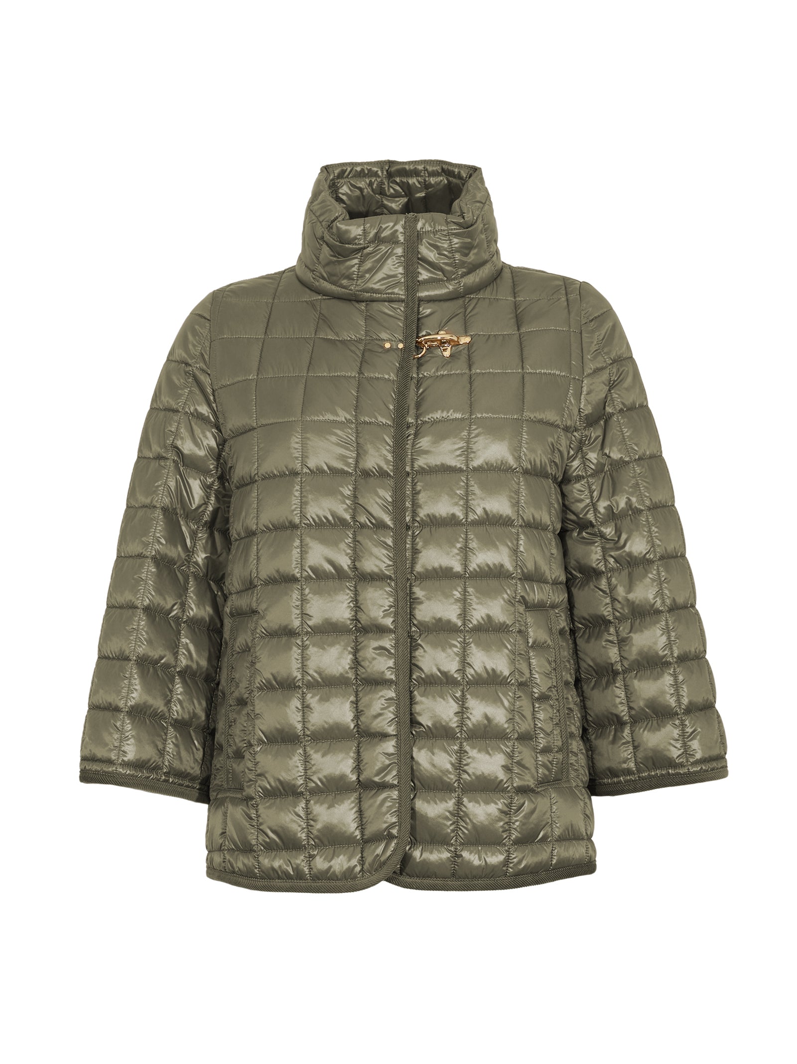 Cappa da donna in nylon lucido trapuntato con profili in velluto, tinta unita. Presenta maniche ampie a tre quarti, collo alto imbottito, chiusura con zip frontale e gancio metallico Fay, tasche laterali a filetto, cuciture impunturate e logo Fay sul gancio. Foderata, dalla vestibilità comoda e leggermente svasata.