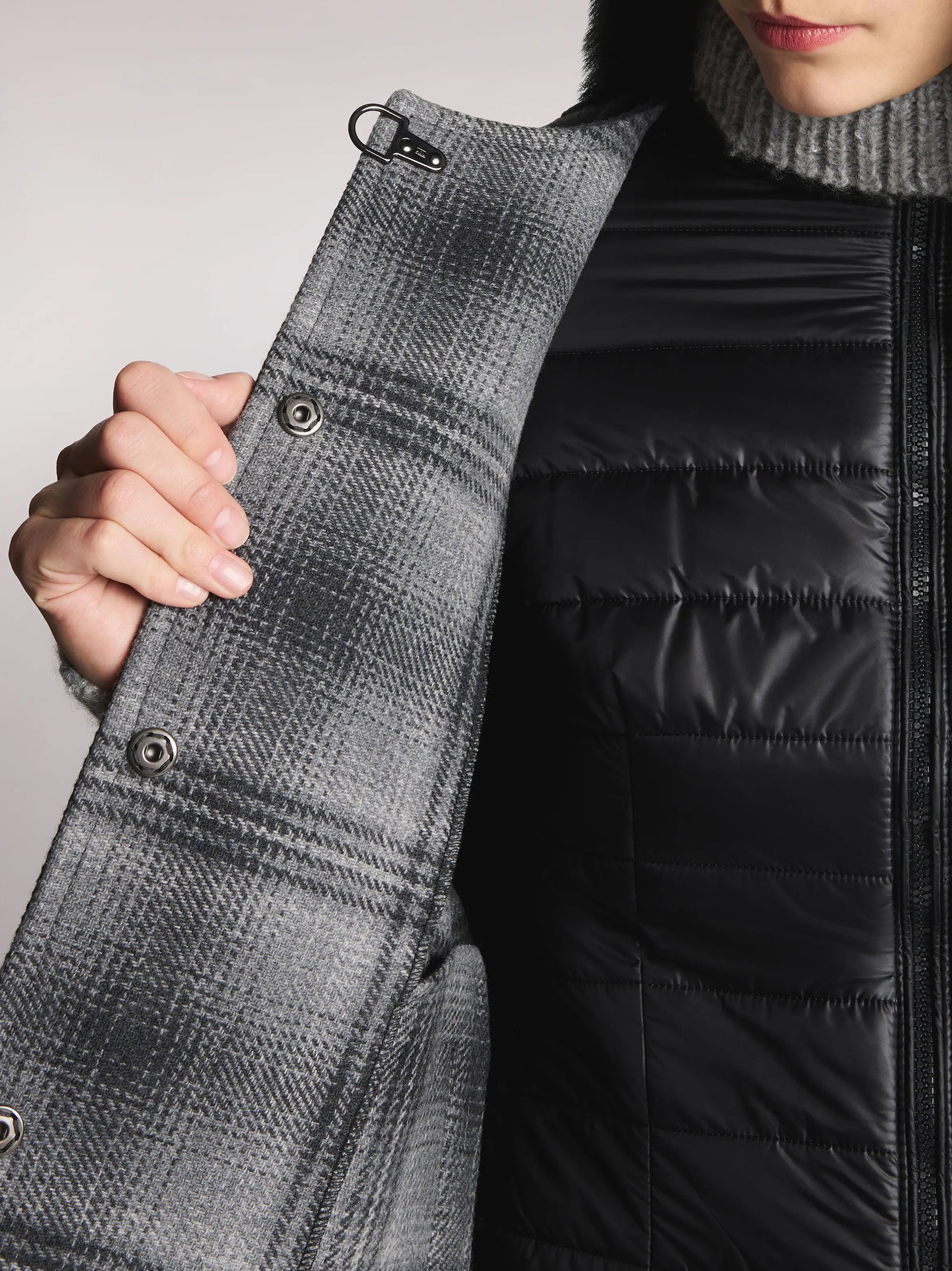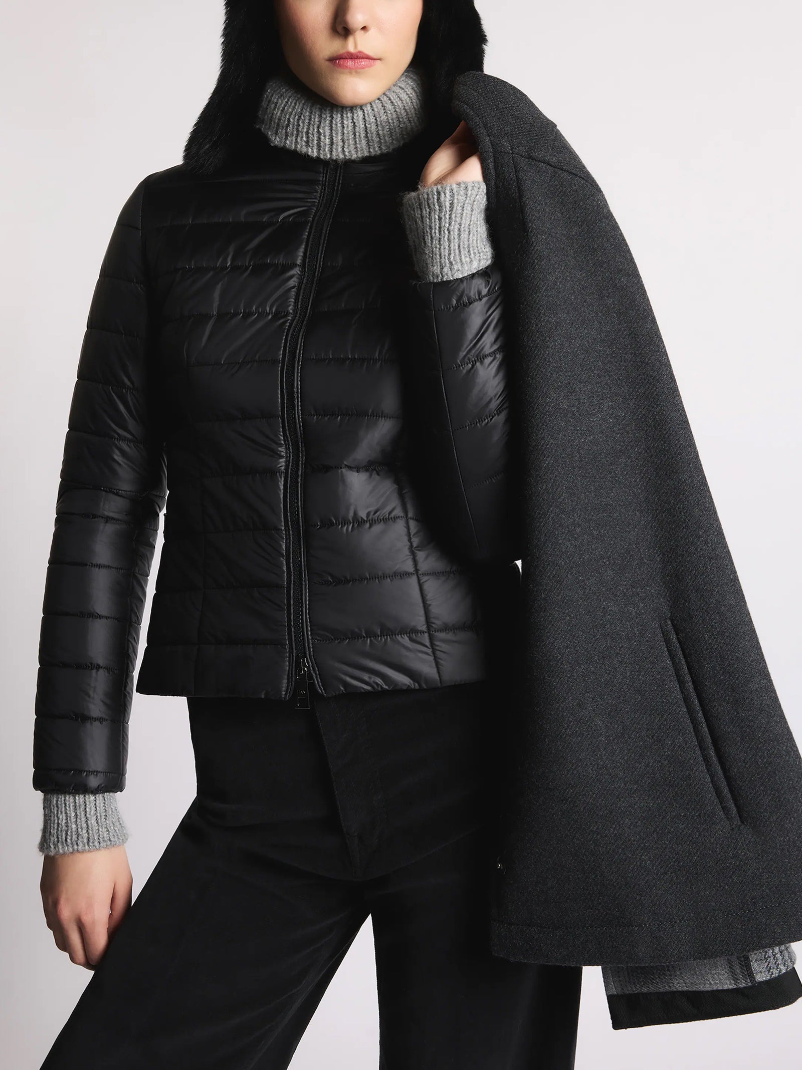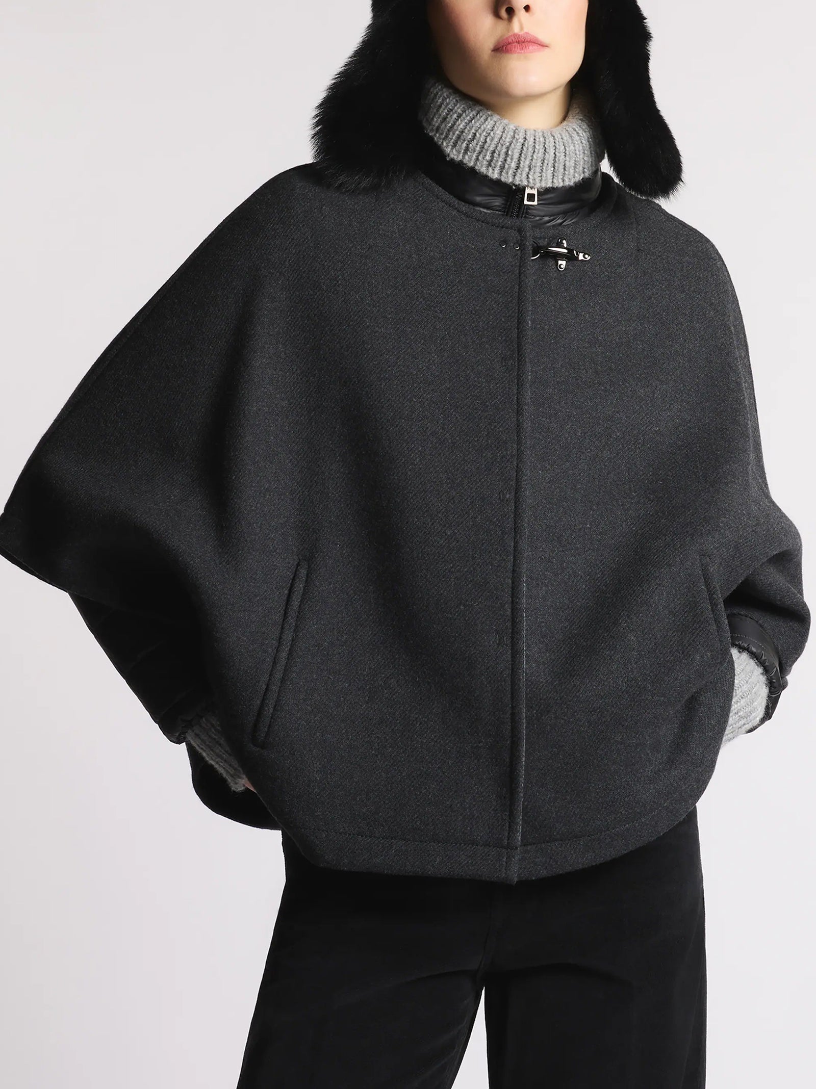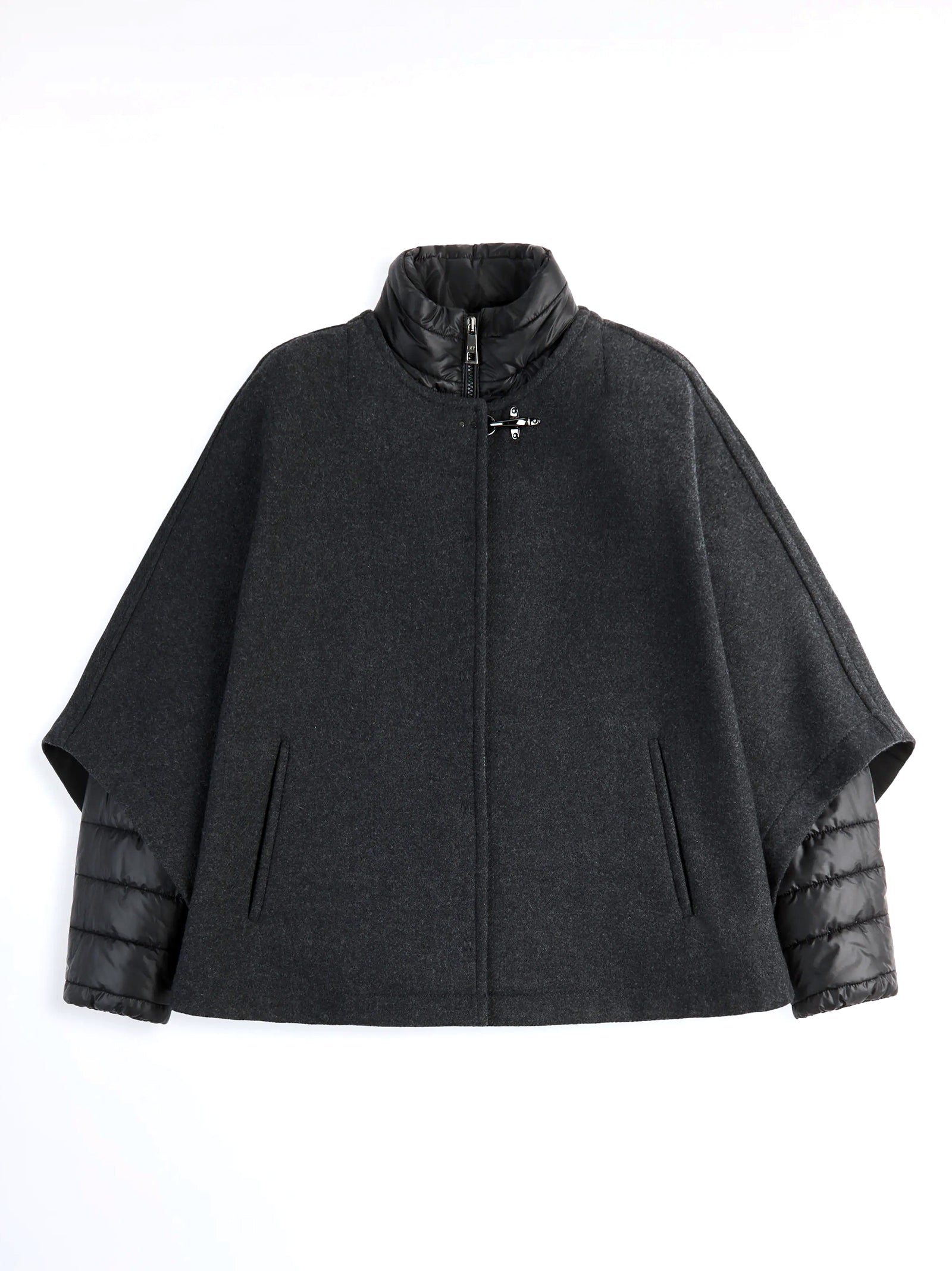 La mantella double 3 in 1 unisce eleganza e funzionalità: il capo esterno in morbida lana cardata double-face ha chiusura con gancio Fay, automatici nascosti e tasche laterali a filo. La giacca interna removibile è imbottita in ovatta, con zip a doppio cursore, logo Fay ricamato sulla manica e tasche laterali con zip invisibile.