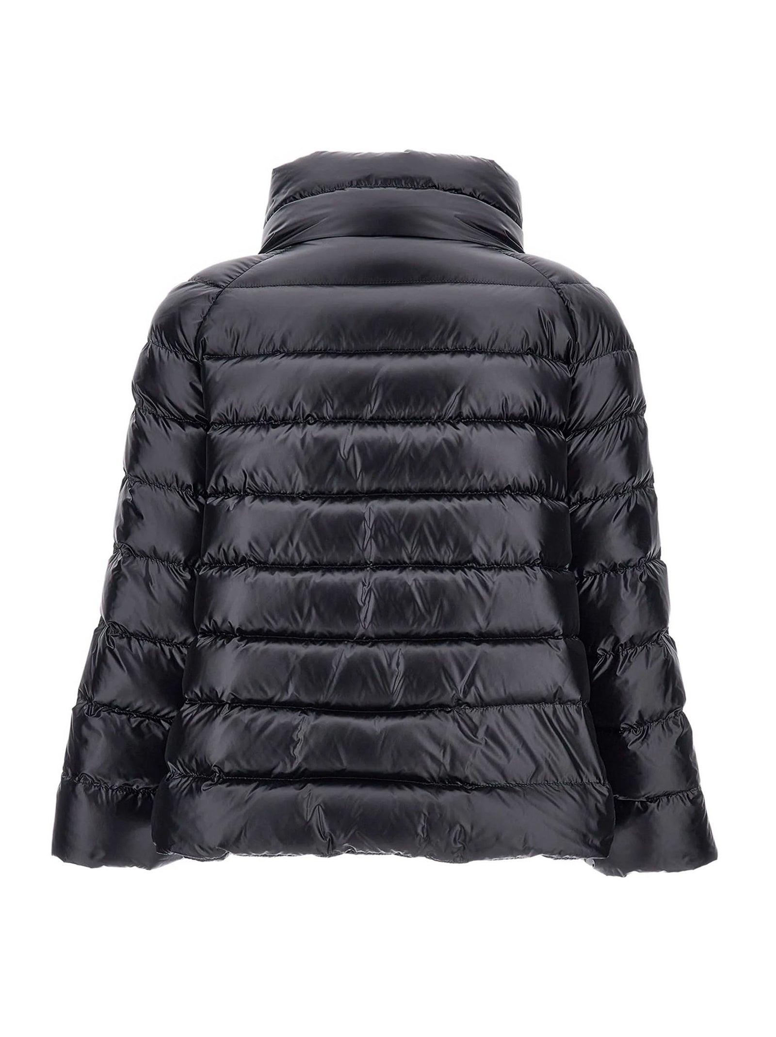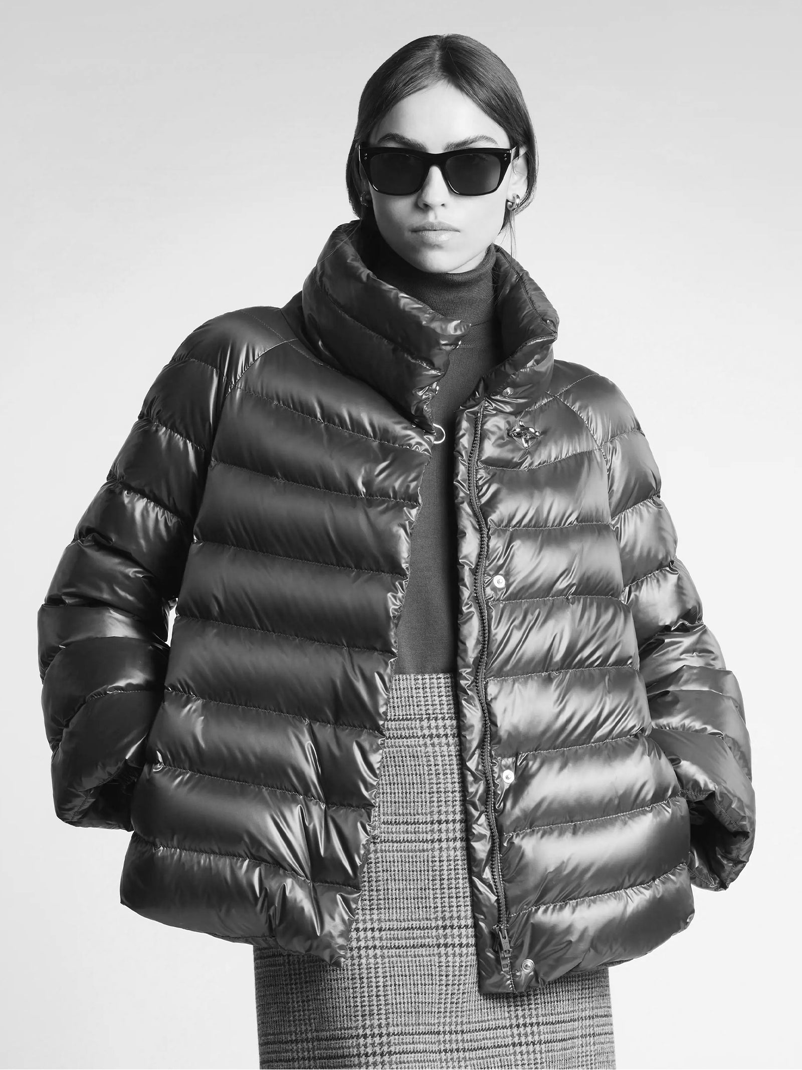 Questo piumino essenziale presenta linee geometriche, un ampio collo morbido e avvolgente. Realizzato in nylon leggero, downproof e idrorepellente, è imbottito in piuma con trapuntatura a righe. Ha maniche raglan, chiusura con zip, automatici invisibili, gancio Fay al collo e tasche laterali a filo con zip.