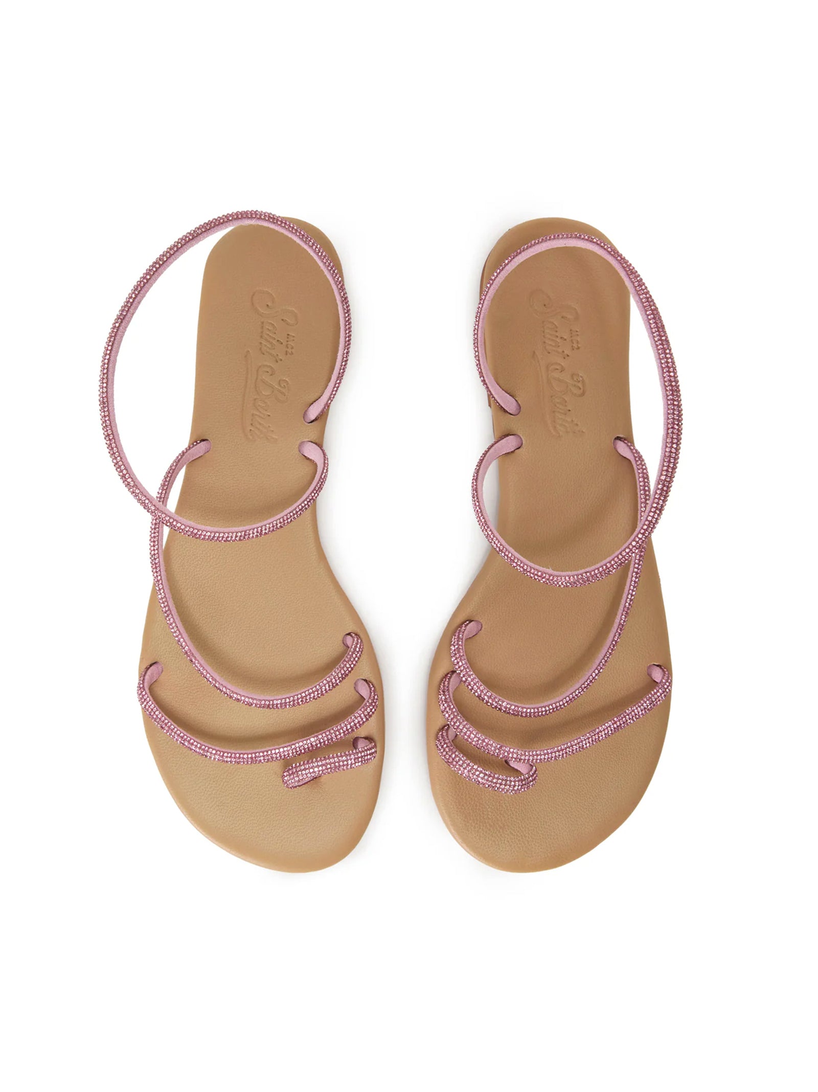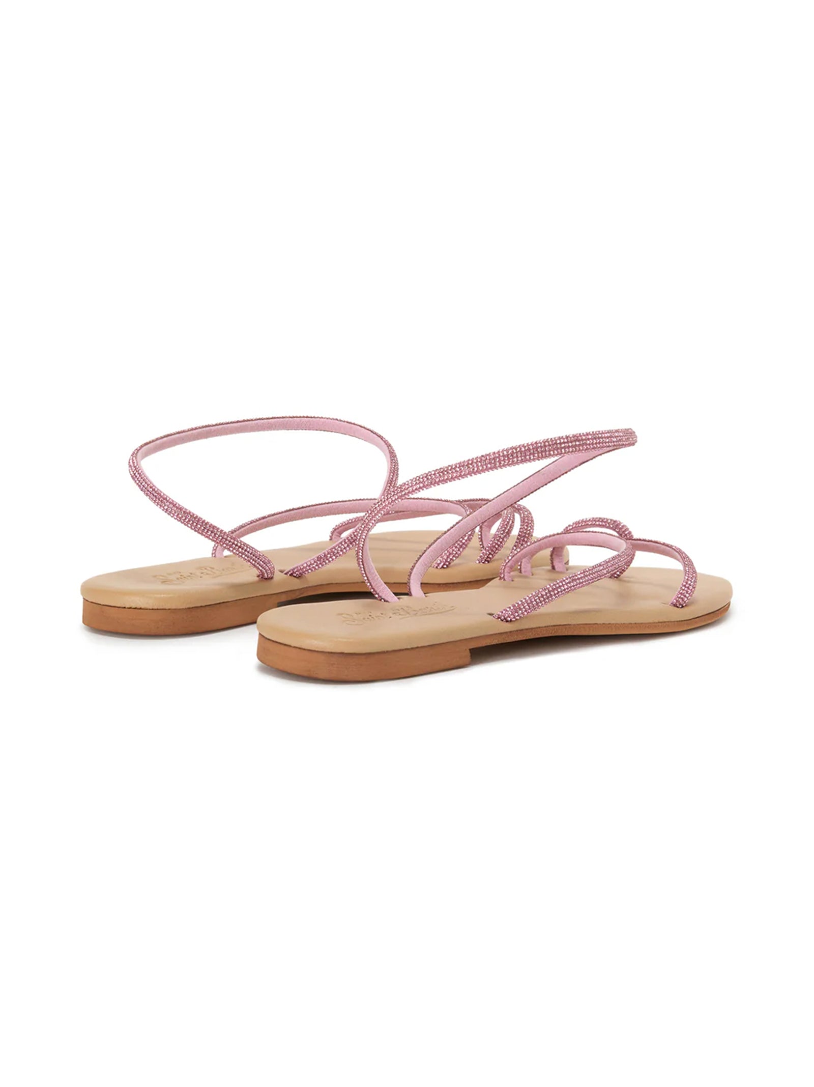 Sandalo basso elegante e luminoso, con sottili fasce impreziosite da strass che avvolgono il piede. Leggero e confortevole, in argento con soletta nude, ideale per look estivi femminili e brillanti.
