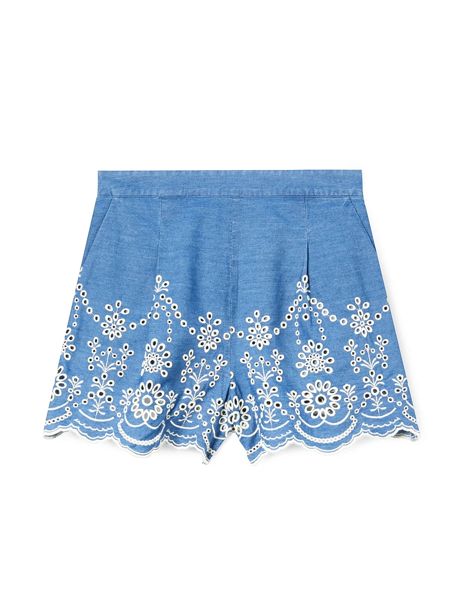 Gli shorts Amani sono in puro cotone chambray leggero, blu effetto denim, con design pulito e contemporaneo. Presentano vita elasticizzata, ricamo sangallo a contrasto sull orlo e tasche laterali, con gamba ampia e vestibilità rilassata.