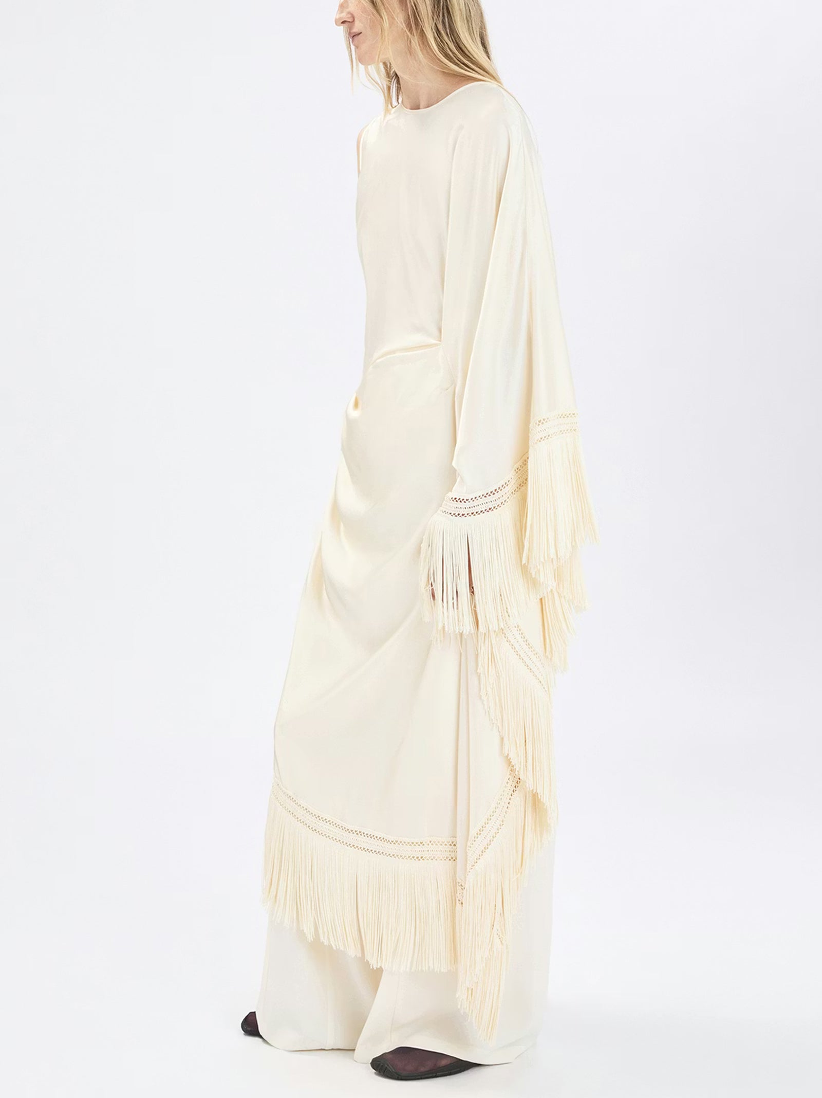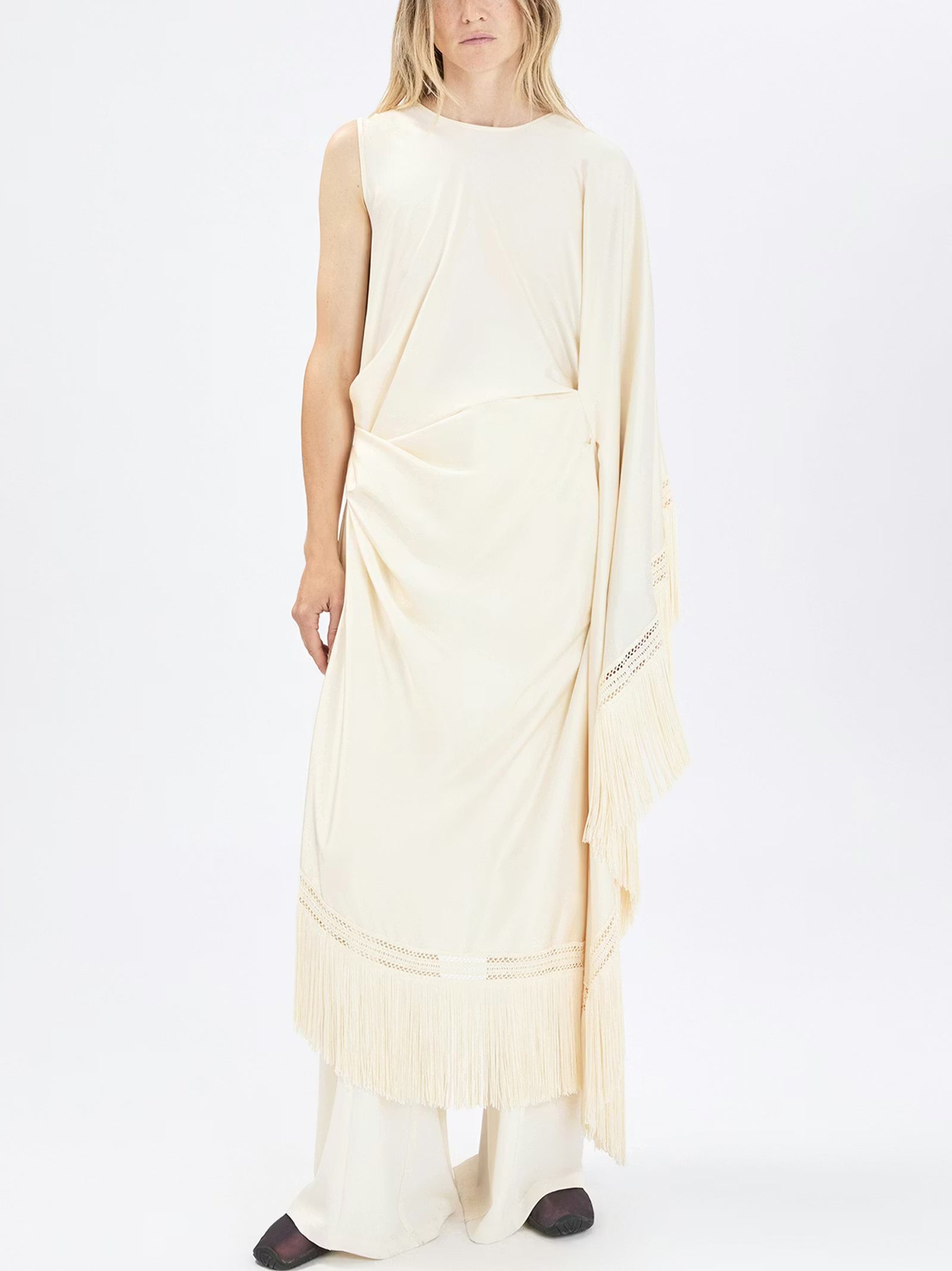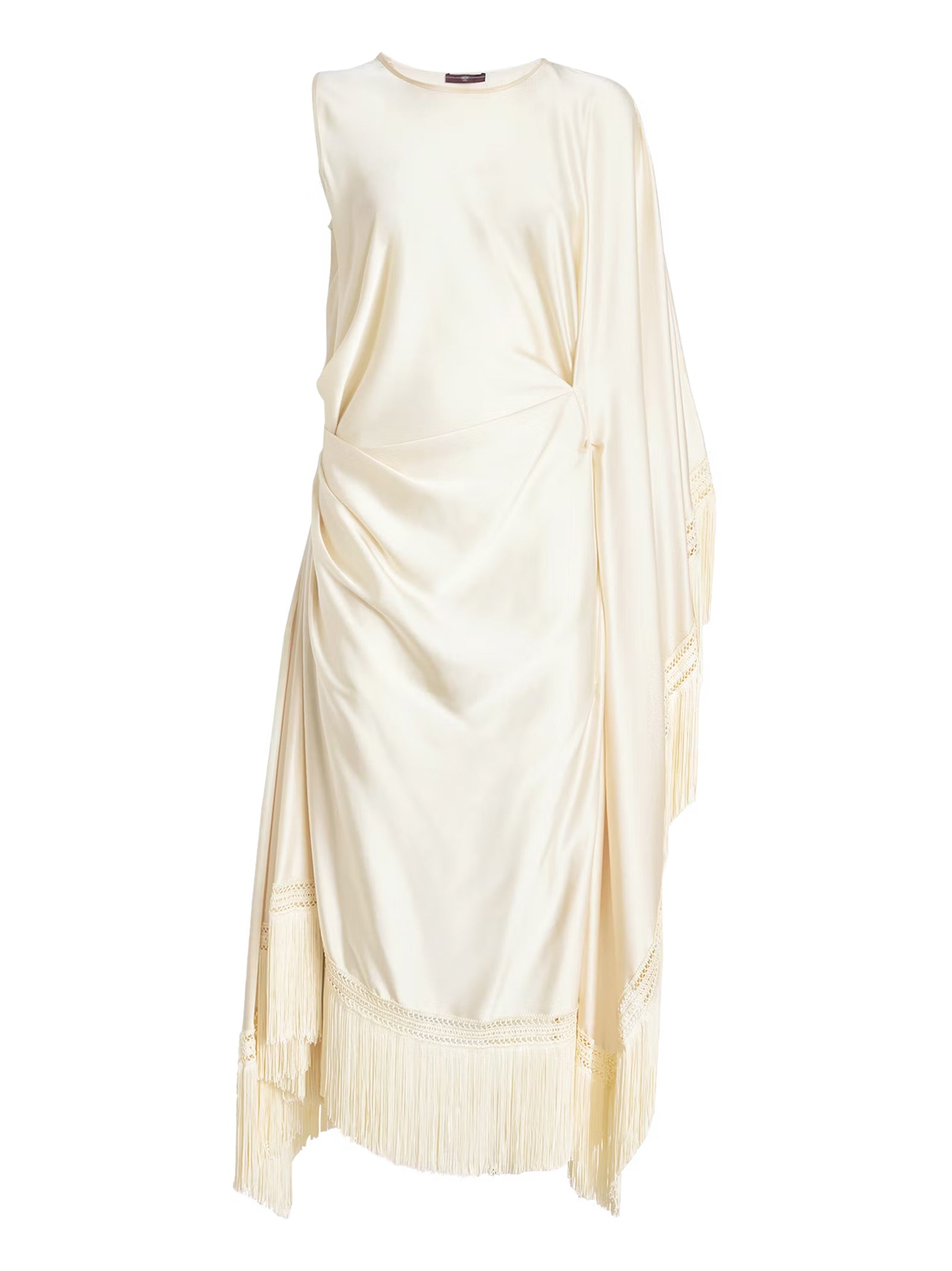 Abito monospalla Condone dal design sofisticato e artigianale, con passamaneria, frange e drappeggio laterale per un effetto elegante e sensuale. In crêpe tecnico leggero, sfoderato, con abbottonatura frontale e vestibilità morbida; scegliere la propria taglia abituale.