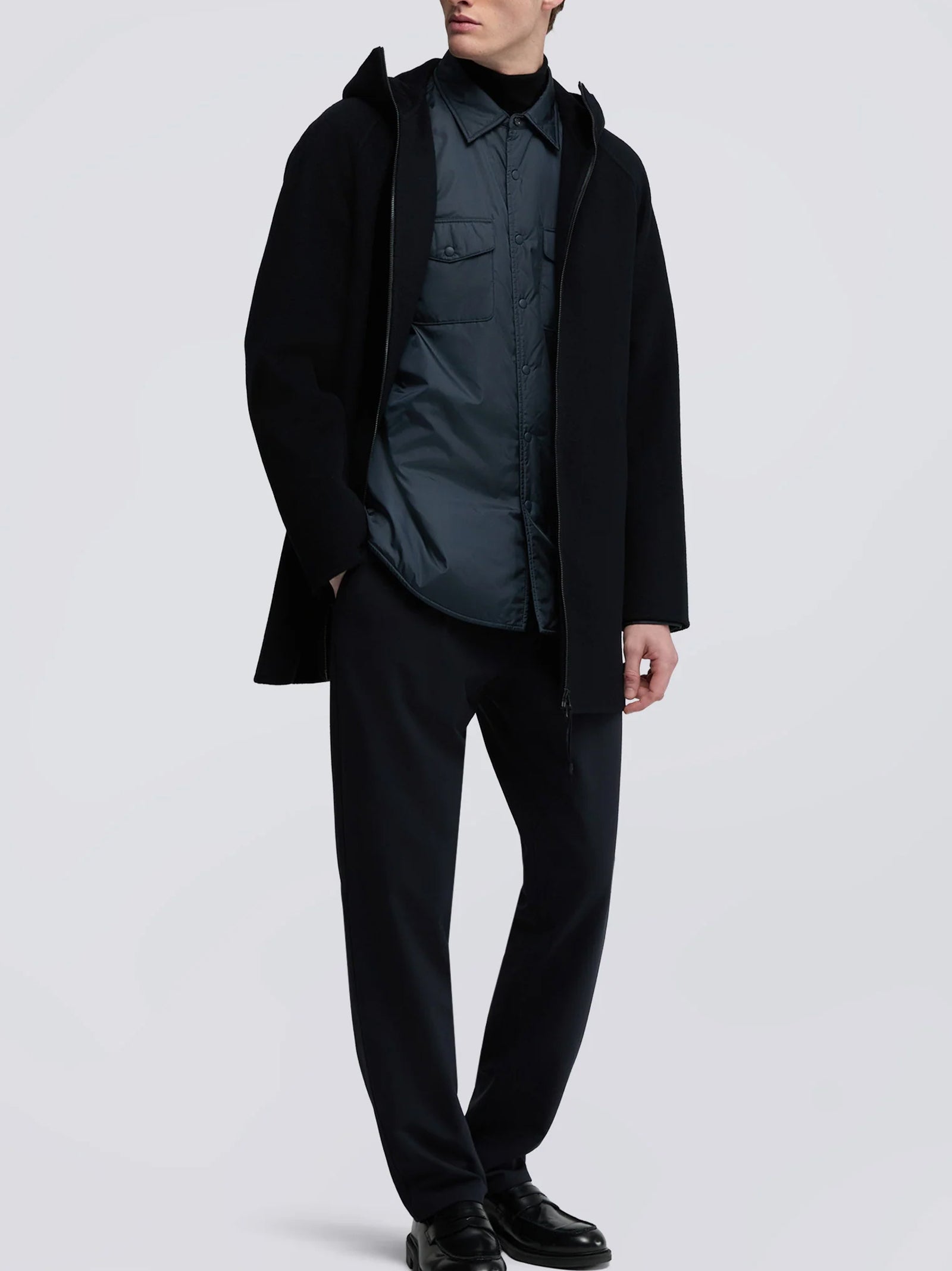 Giubbotto dal taglio dritto in caldo tessuto double di lana, con cappuccio fisso regolabile e due tasche a filetto frontali. Chiusura con zip e tirazip logato. Vestibilità regolare.