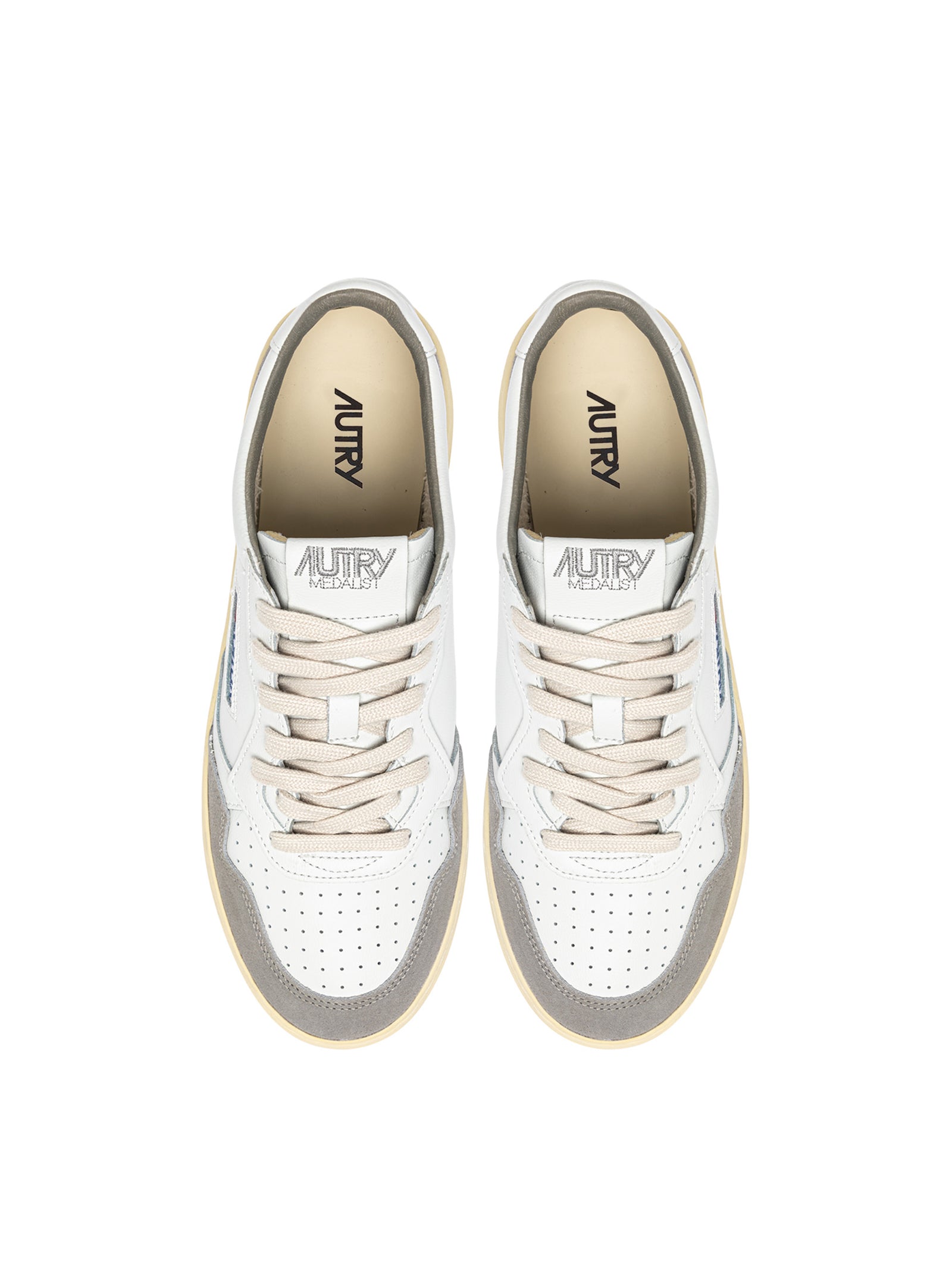 Le sneaker Medalist Low di Autry sono realizzate in pelle naturale e presentano microforature sulla punta per una migliore traspirazione. Il design, ispirato ai modelli da tennis degli anni 80, si distingue per le cuciture a vista, i lacci piatti in cotone e la linguetta con etichetta cucita. Completano la scarpa il colletto imbottito e il tallone con inserto in pelle che dona un tocco iconico.