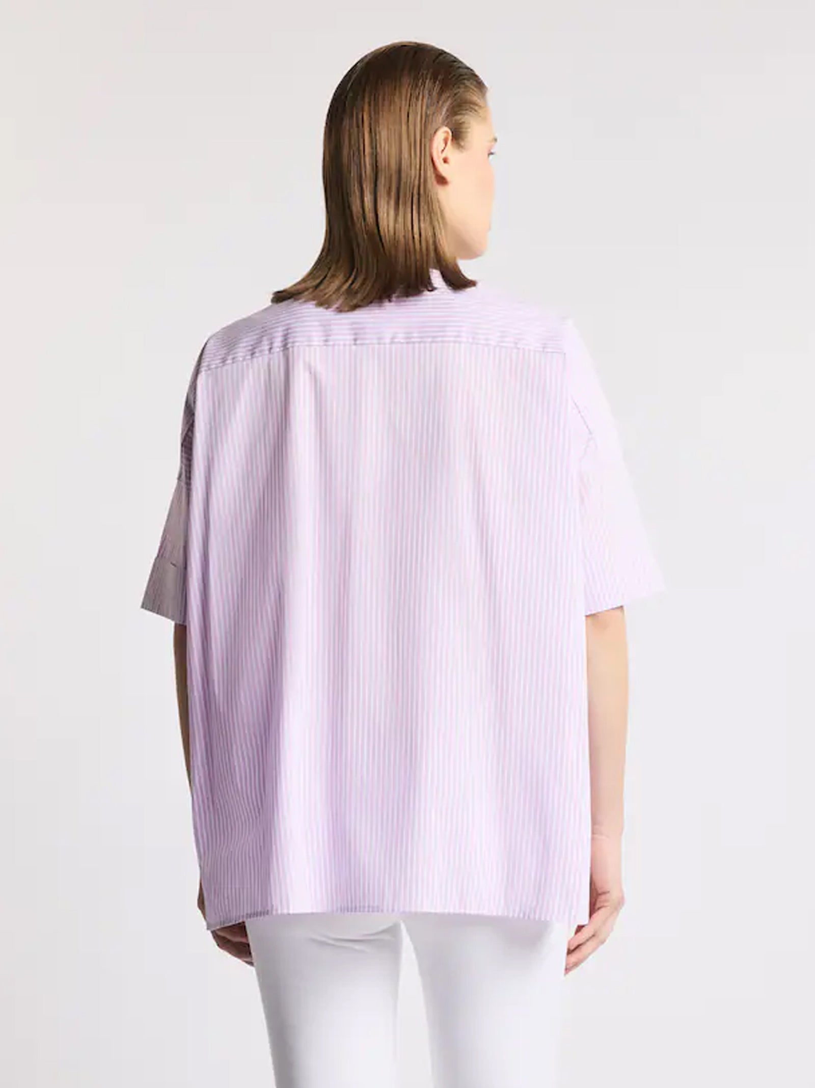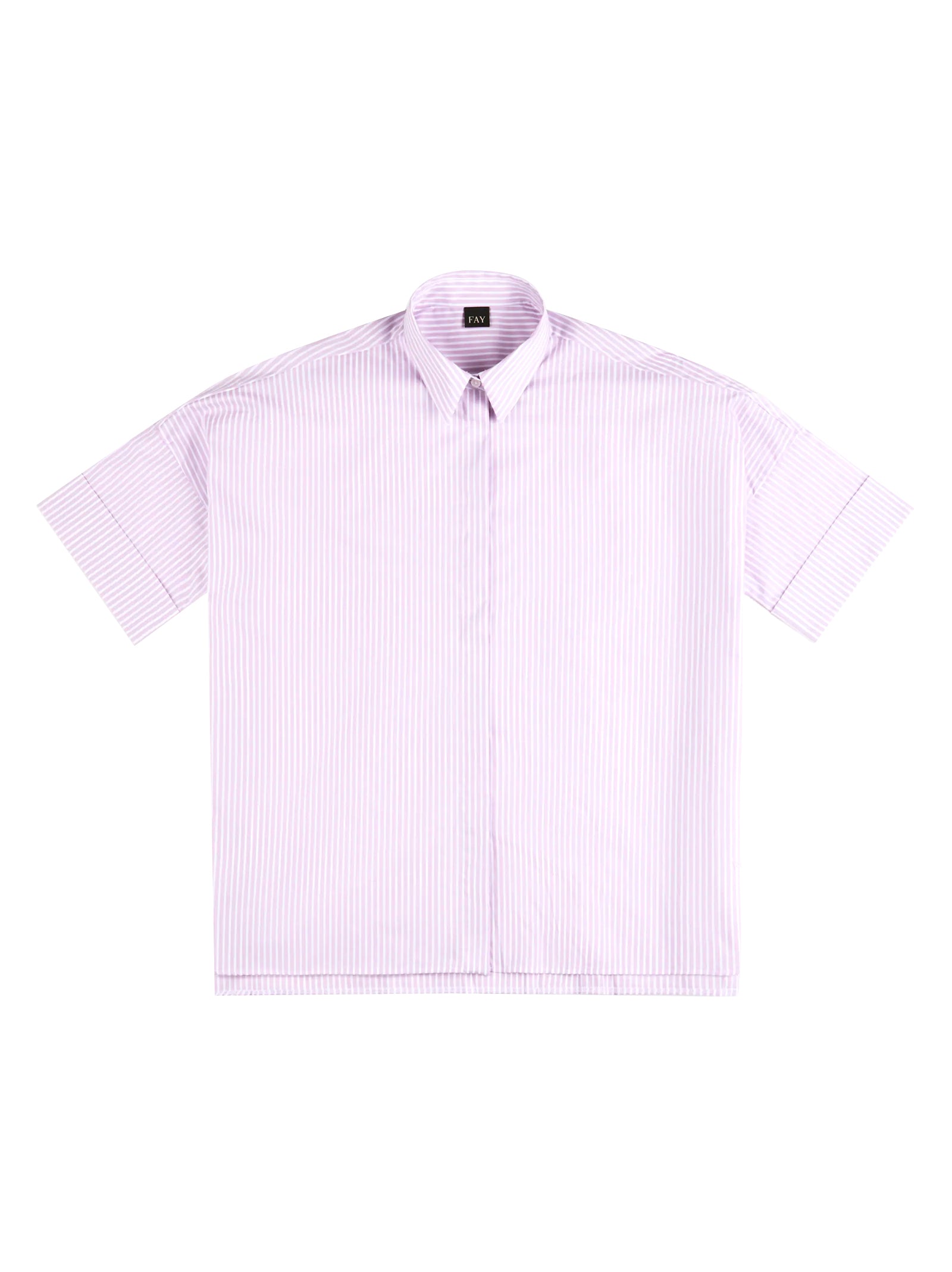 Camicia a righe in popeline di cotone stretch, con maniche corte, spacchetti laterali e allacciatura nascosta. Rifinita con logo Fay ricamato sul fondo. Vestibilità comfort.