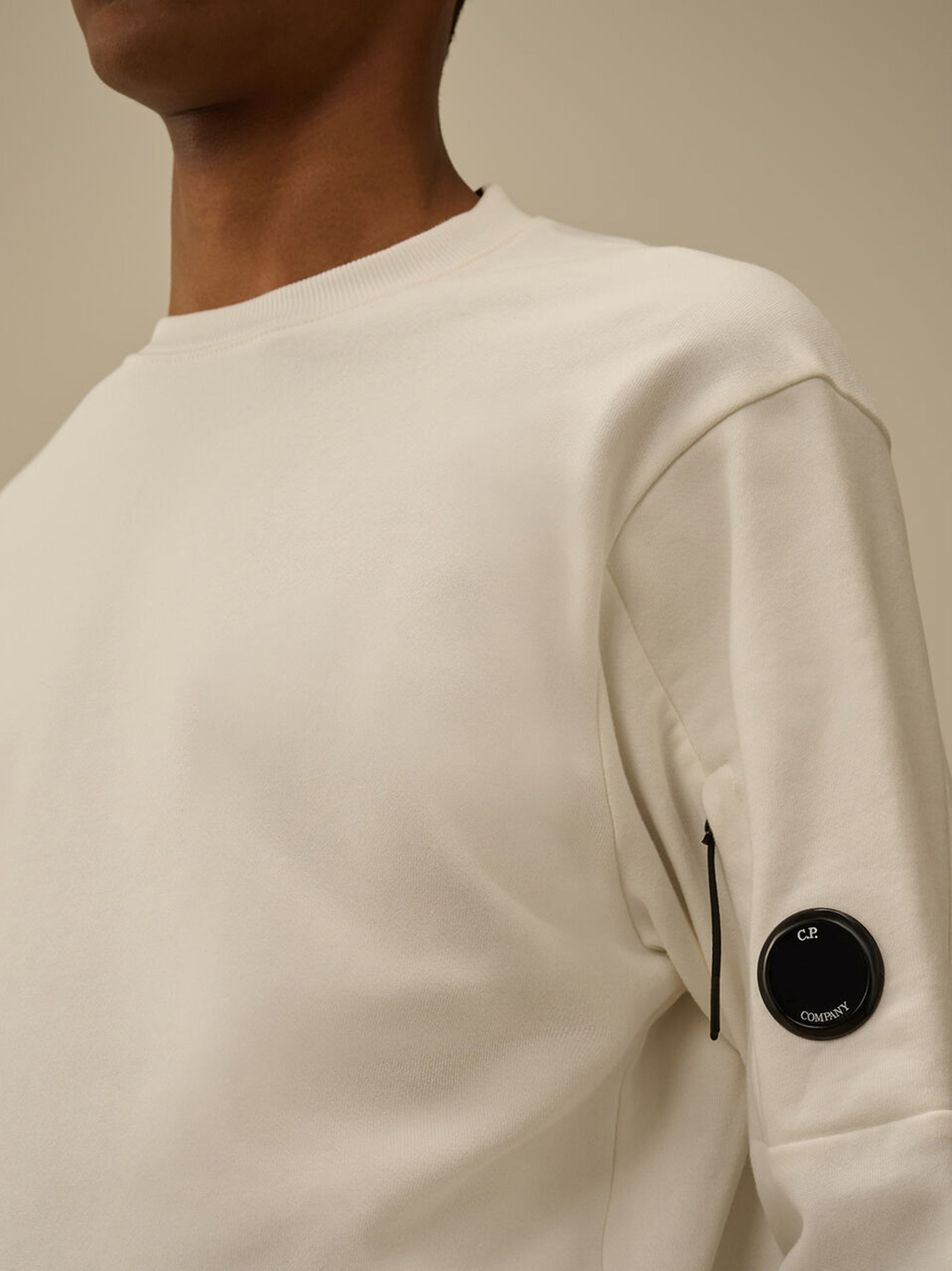 Felpa girocollo realizzata in Diagonal Raised Fleece, un cotone spazzolato a trama diagonale di peso medio, logo ricamato sul retro del collo, iconica Lente di C.P. Company, polsini e orlo a costine. Regular fit.