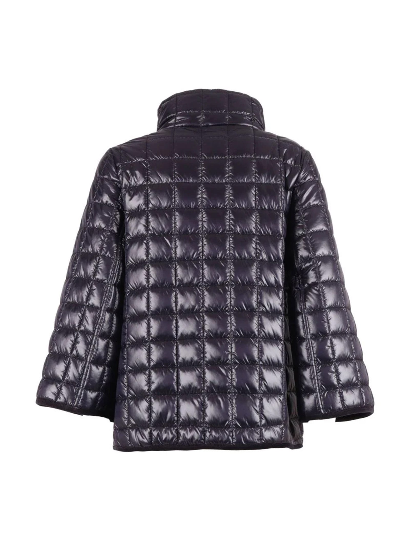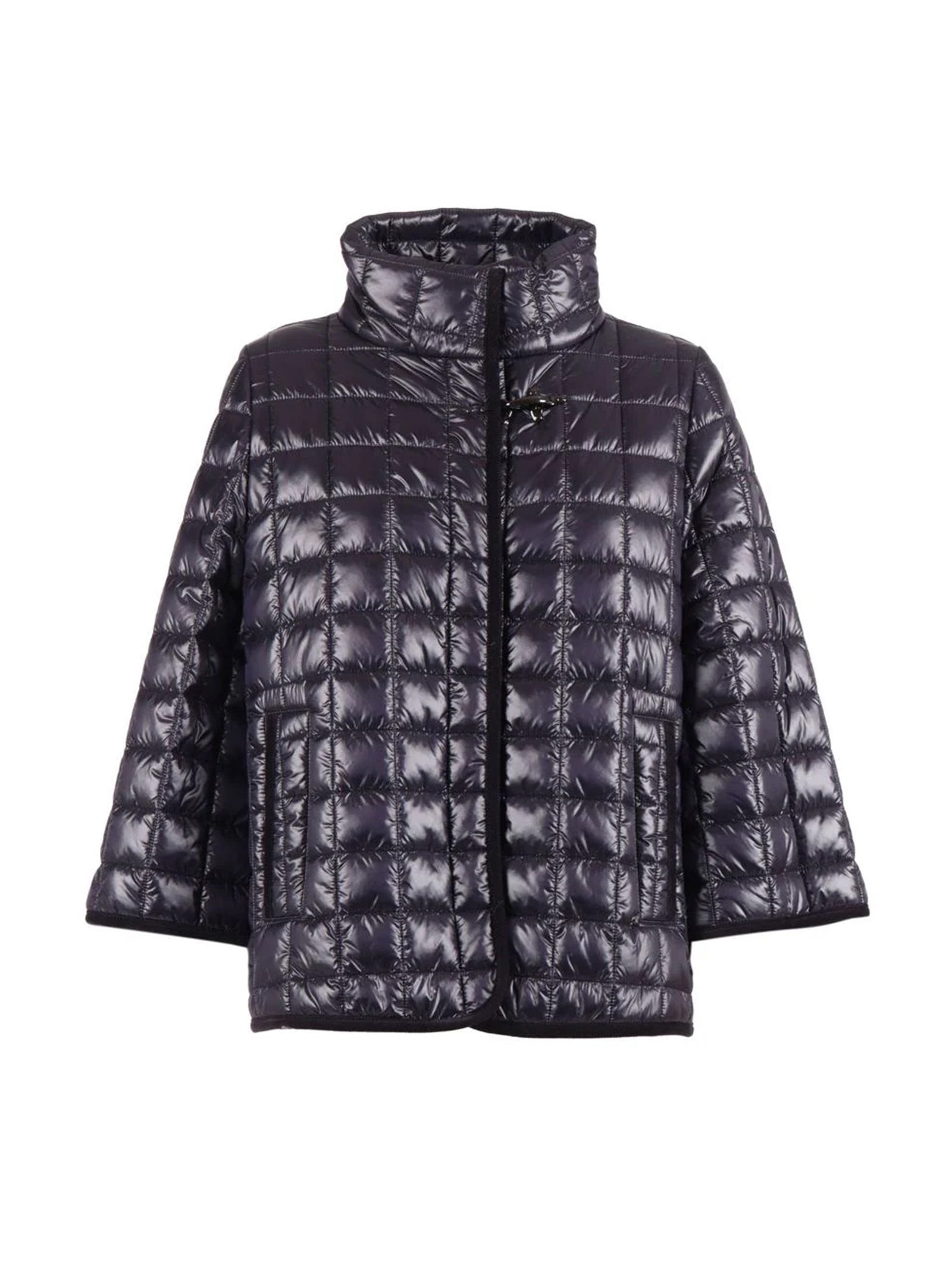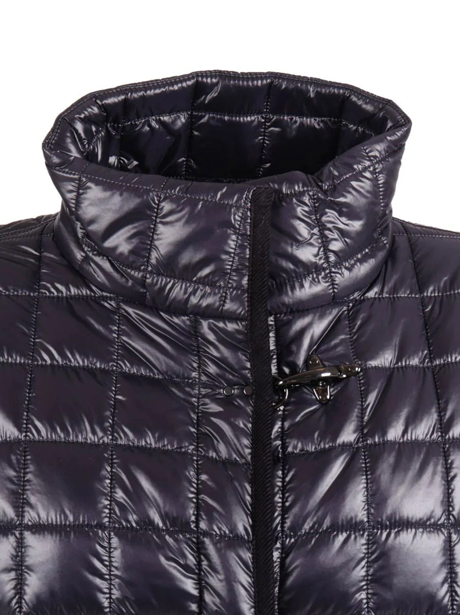 Cappa da donna in nylon lucido trapuntato con profili in velluto, tinta unita. Presenta maniche ampie a tre quarti, collo alto imbottito, chiusura con zip frontale e gancio metallico Fay, tasche laterali a filetto, cuciture impunturate e logo Fay sul gancio. Foderata, dalla vestibilità comoda e leggermente svasata.