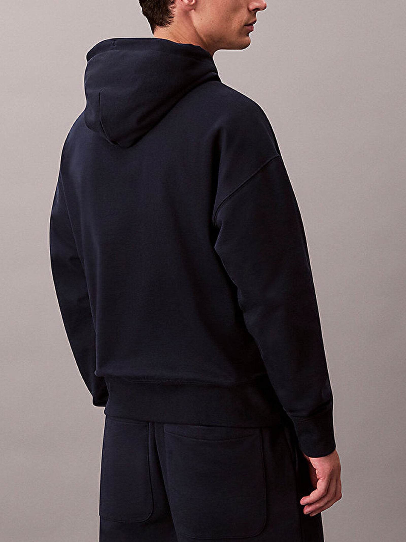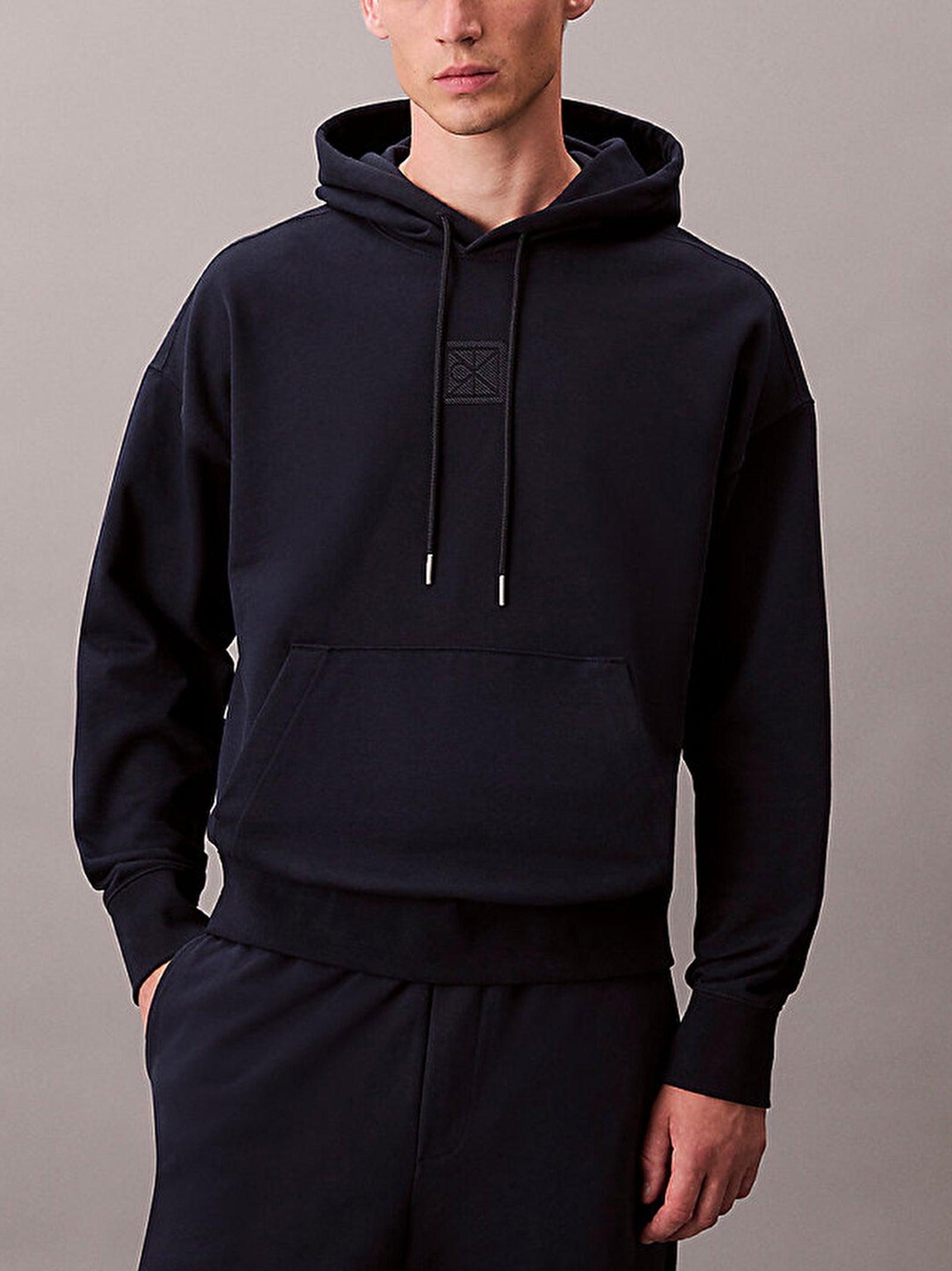 Felpa con cappuccio regolabile, logo ricamato, tasche laterali e finiture a costine su polsini e orlo.