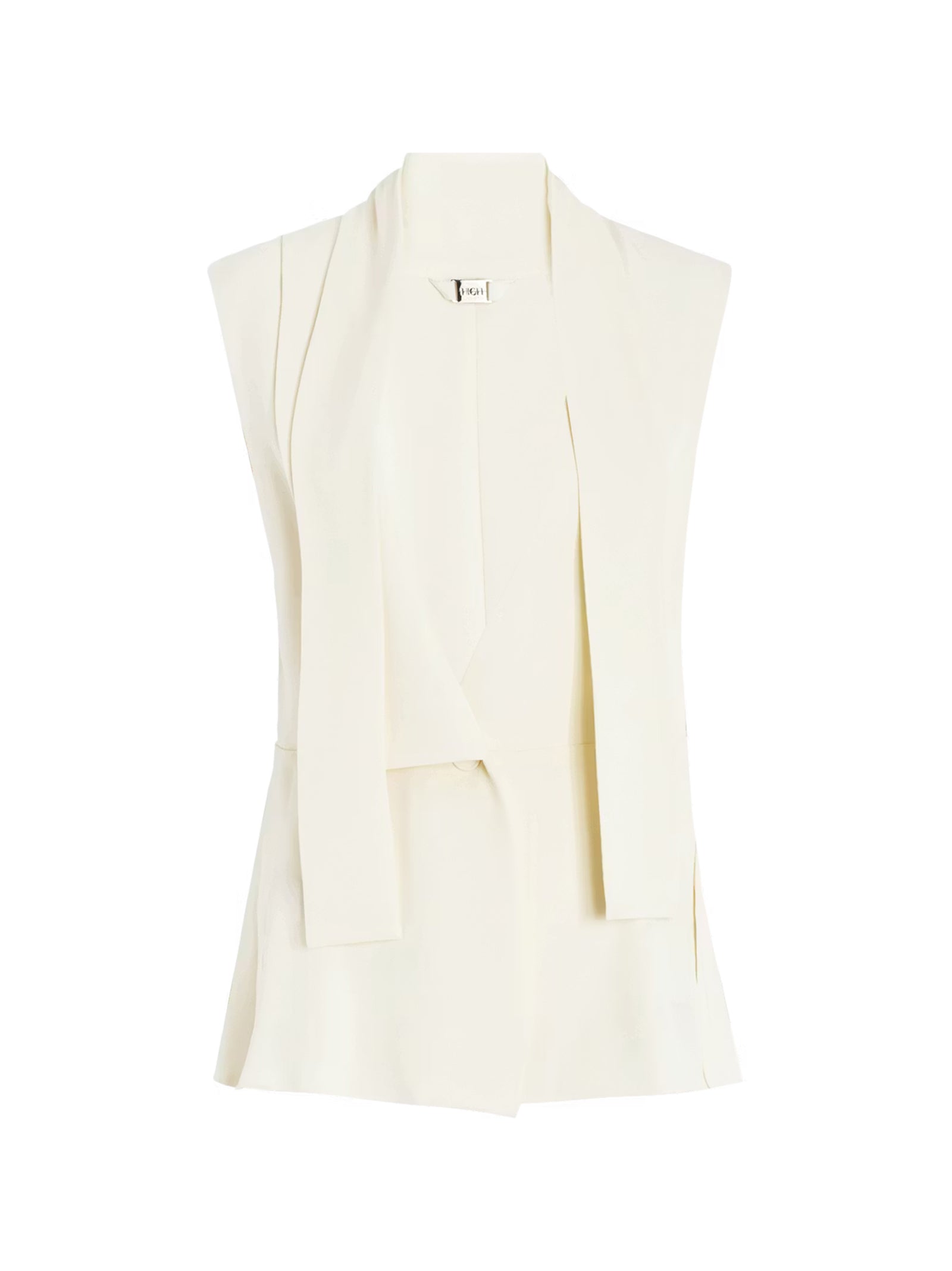 Gilet Clasp in cady crêpe leggero e lievemente satinato, con collo a listino e fusciacca libera. Abbottonatura frontale a un bottone, spacchi laterali e cucitura posteriore a rilievo; sfoderato e dalla silhouette a clessidra.