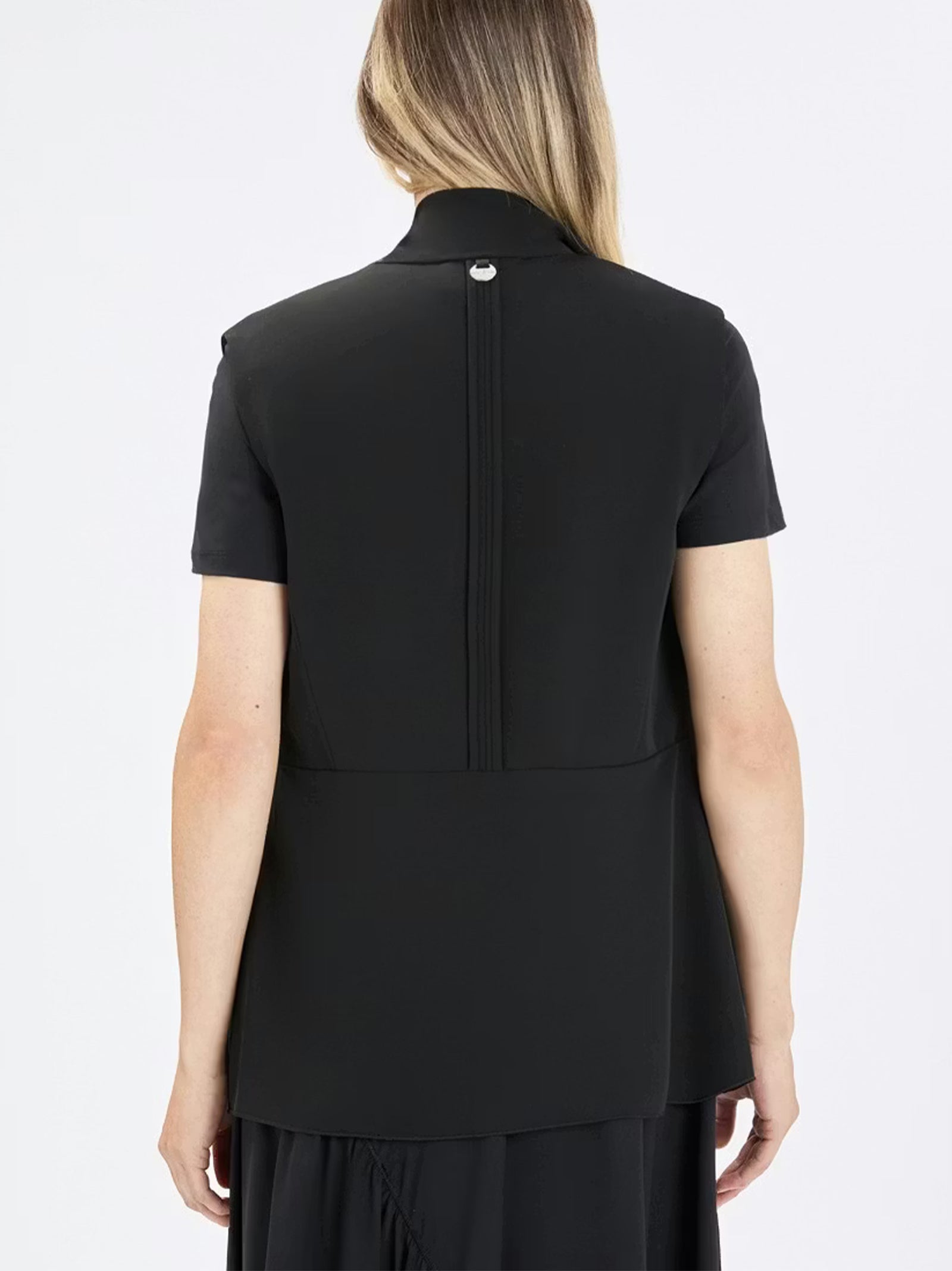 Gilet Clasp in cady crêpe leggero e lievemente satinato, con collo a listino e fusciacca libera. Abbottonatura frontale a un bottone, spacchi laterali e cucitura posteriore a rilievo; sfoderato e dalla silhouette a clessidra.