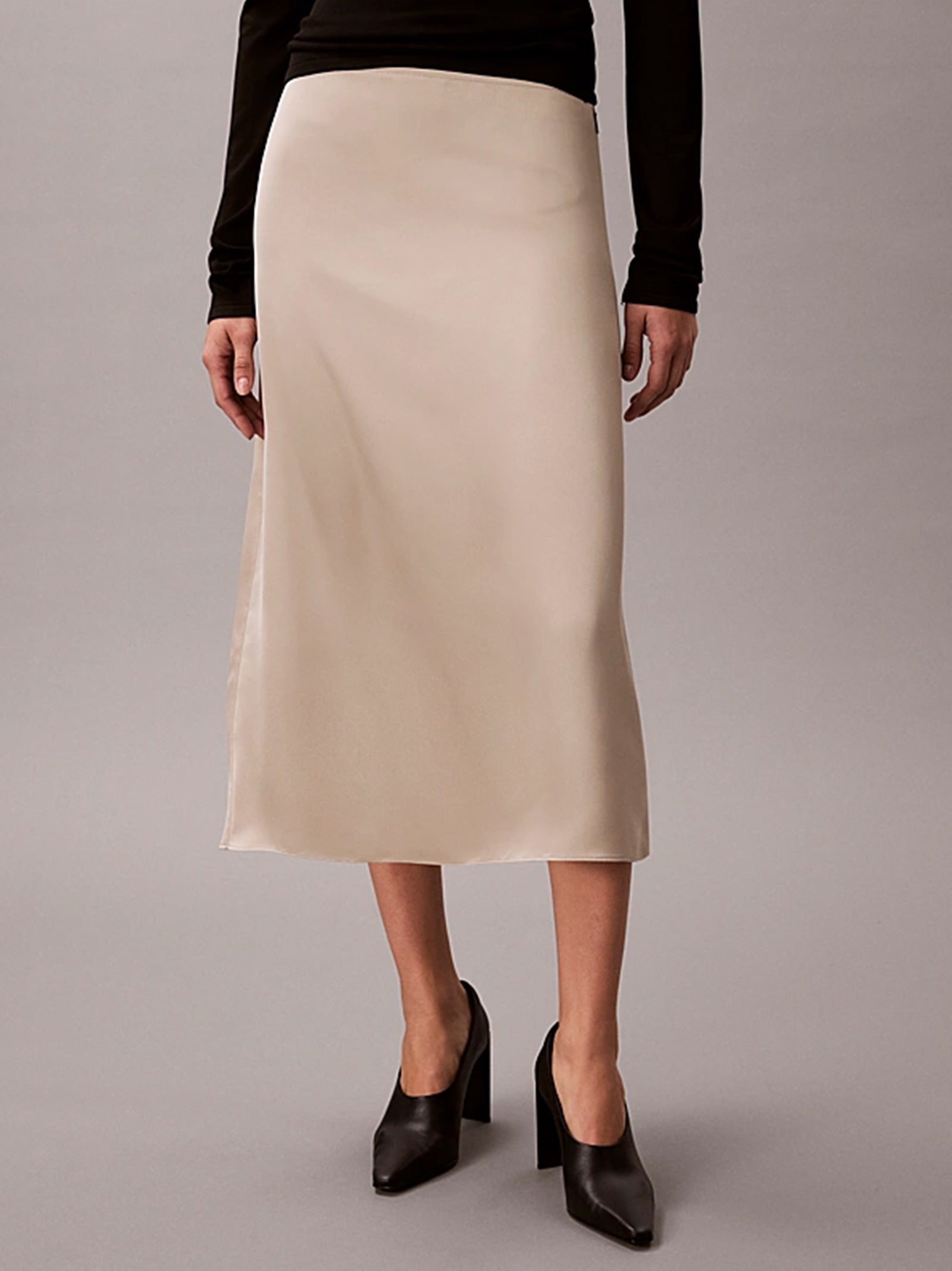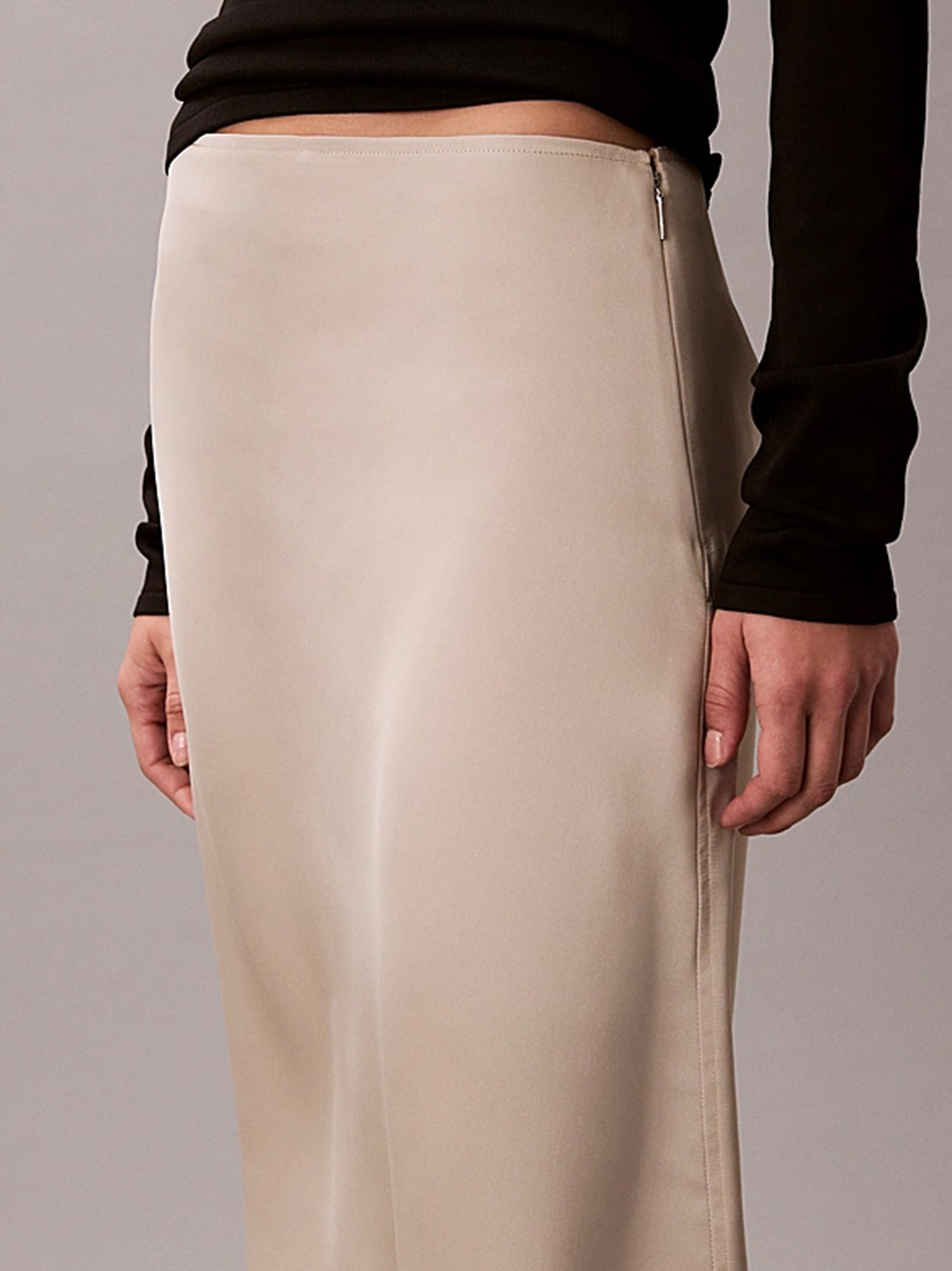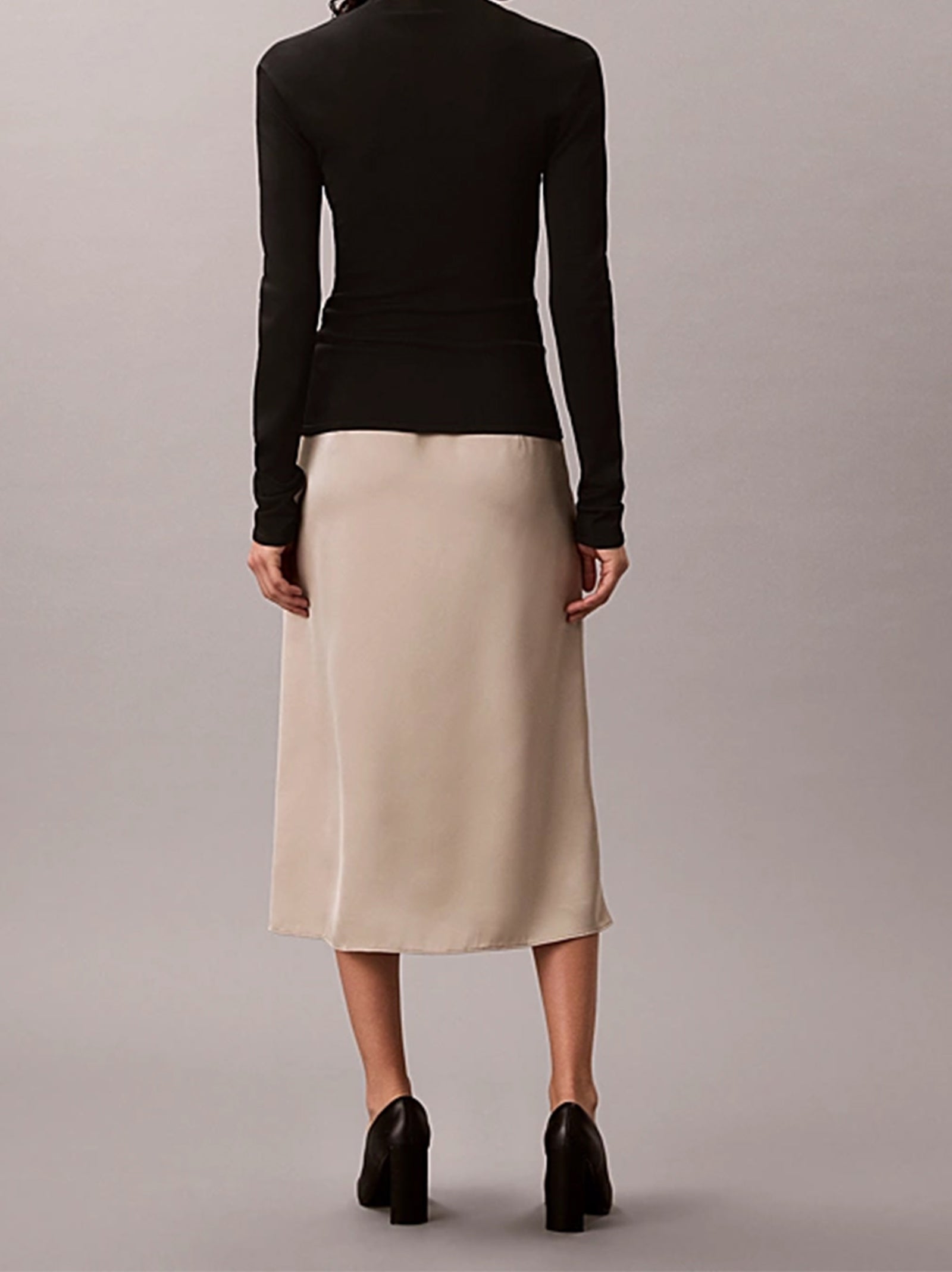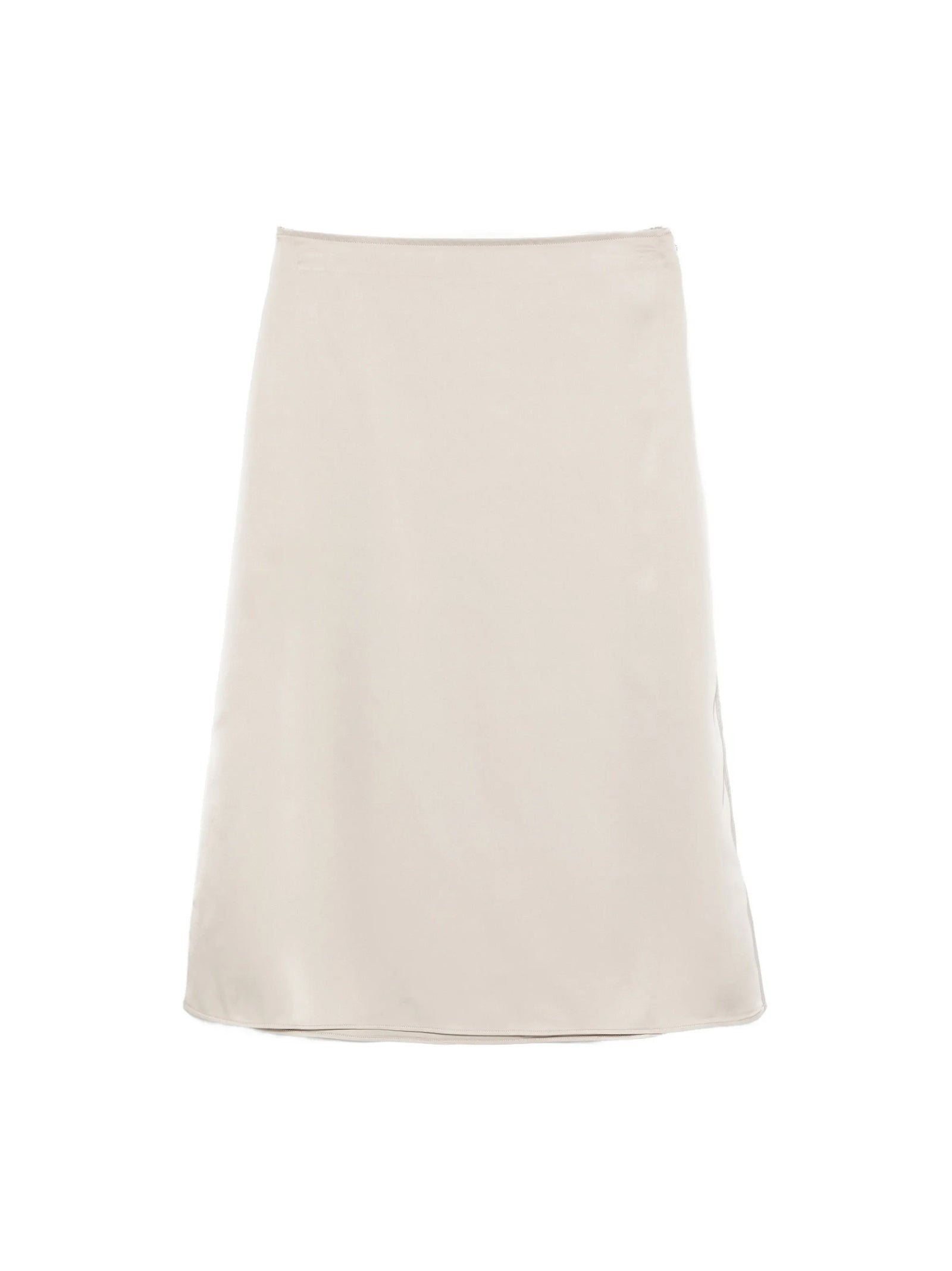 Gonna midi in tessuto satin opaco leggermente lucido, sfoderata, con chiusura posteriore con zip nascosta. Vestibilità regolare, vita alta e leggermente a trapezio.