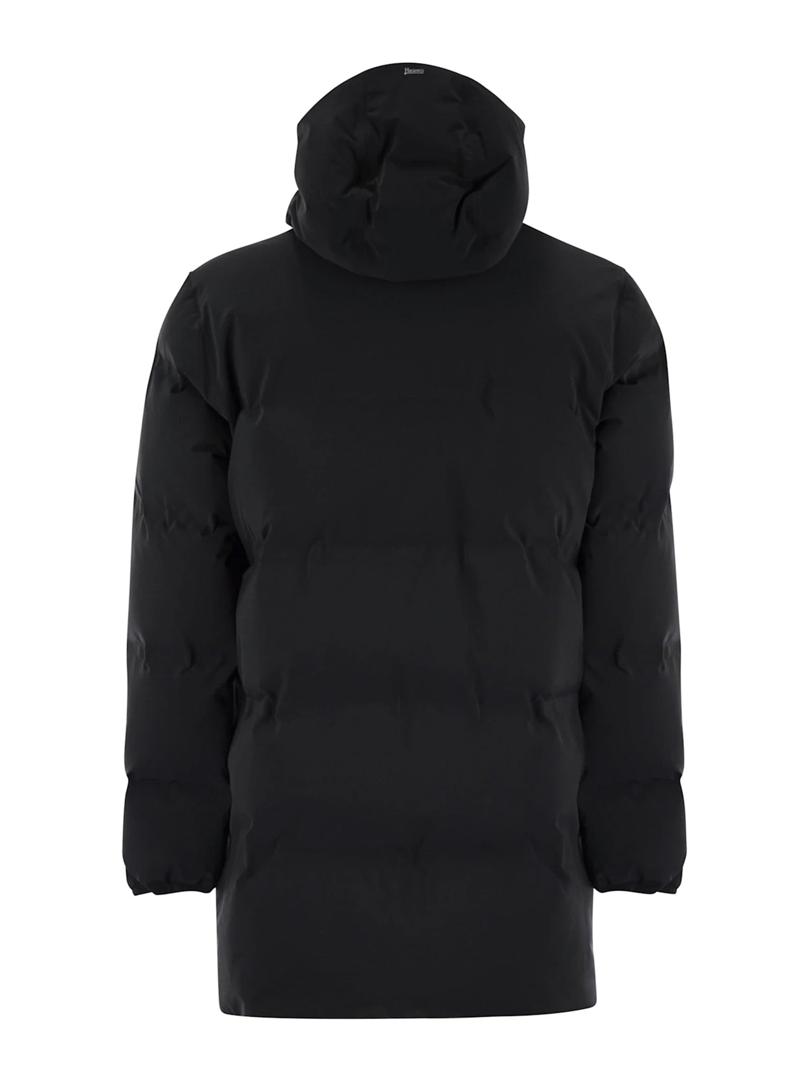 Piumino Herno realizzato in nylon elasticizzato con finitura tecnica e imbottitura in piuma leggera che assicura calore e comfort. Il design presenta linee pulite e moderne, con chiusura frontale con zip, cappuccio integrato, tasche laterali e polsini elasticizzati. La vestibilità è regolare, ideale per un look urbano e raffinato, perfetto per la stagione fredda.
