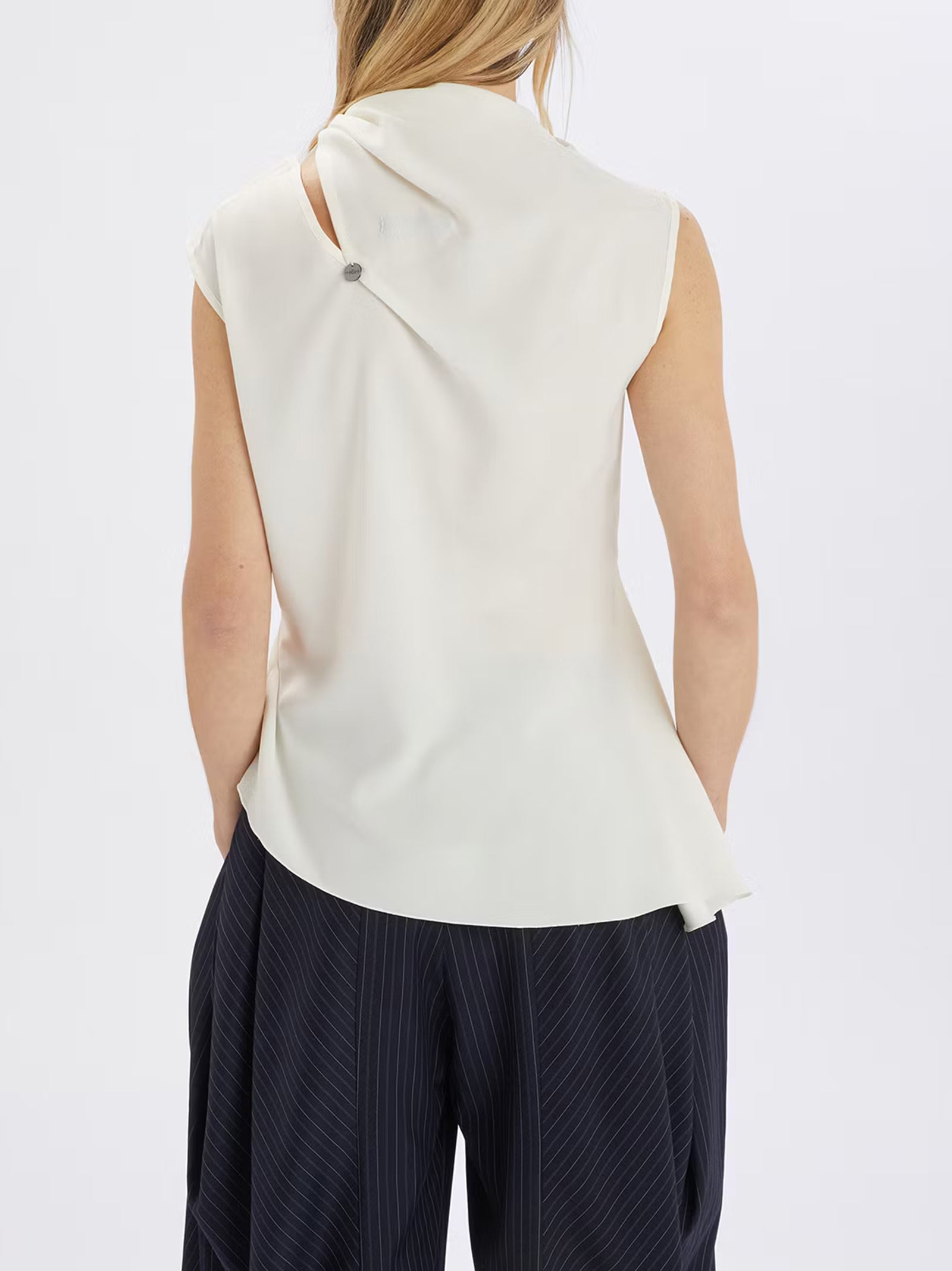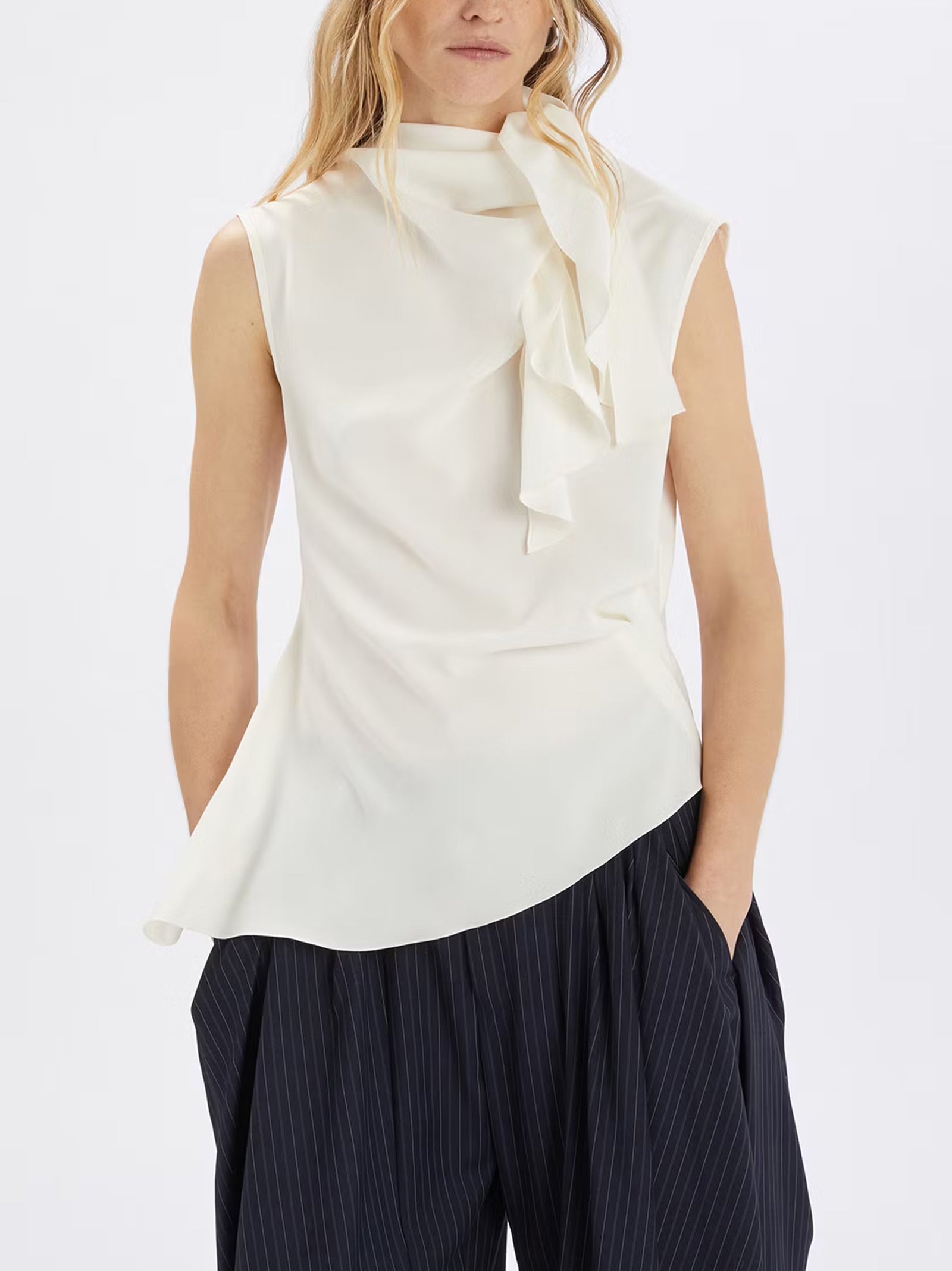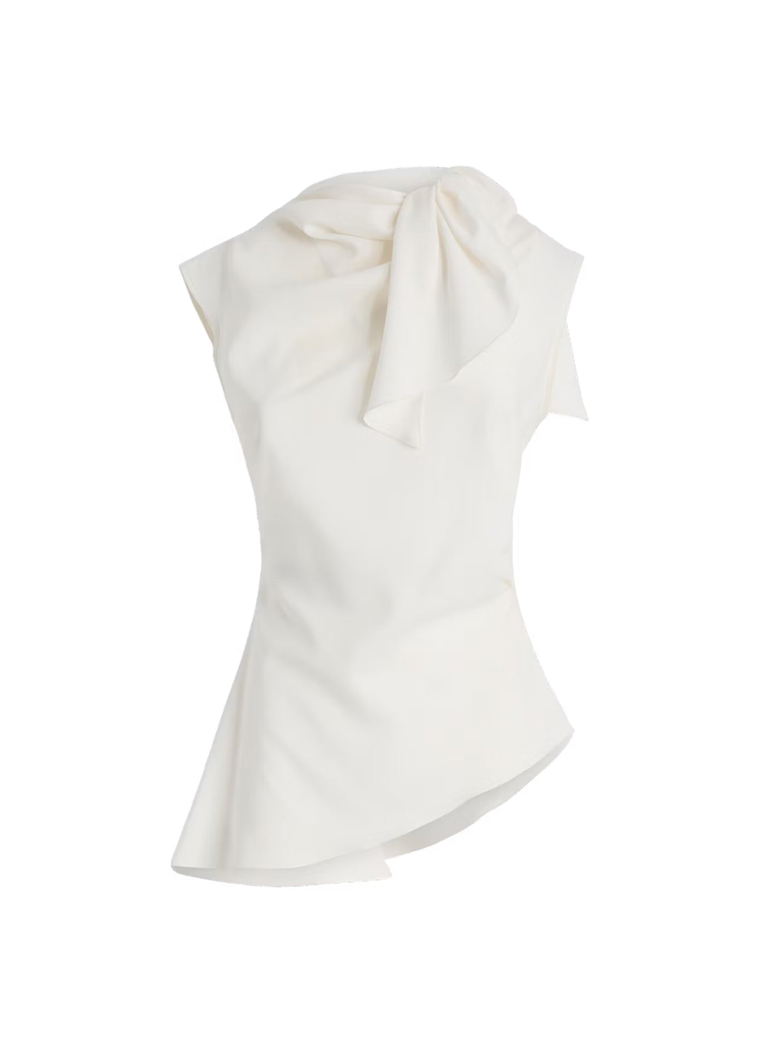 Top Walton in satin leggero, senza maniche, con orlo asimmetrico e jabot laterale annodato al collo, dal taglio fluido che valorizza la silhouette.