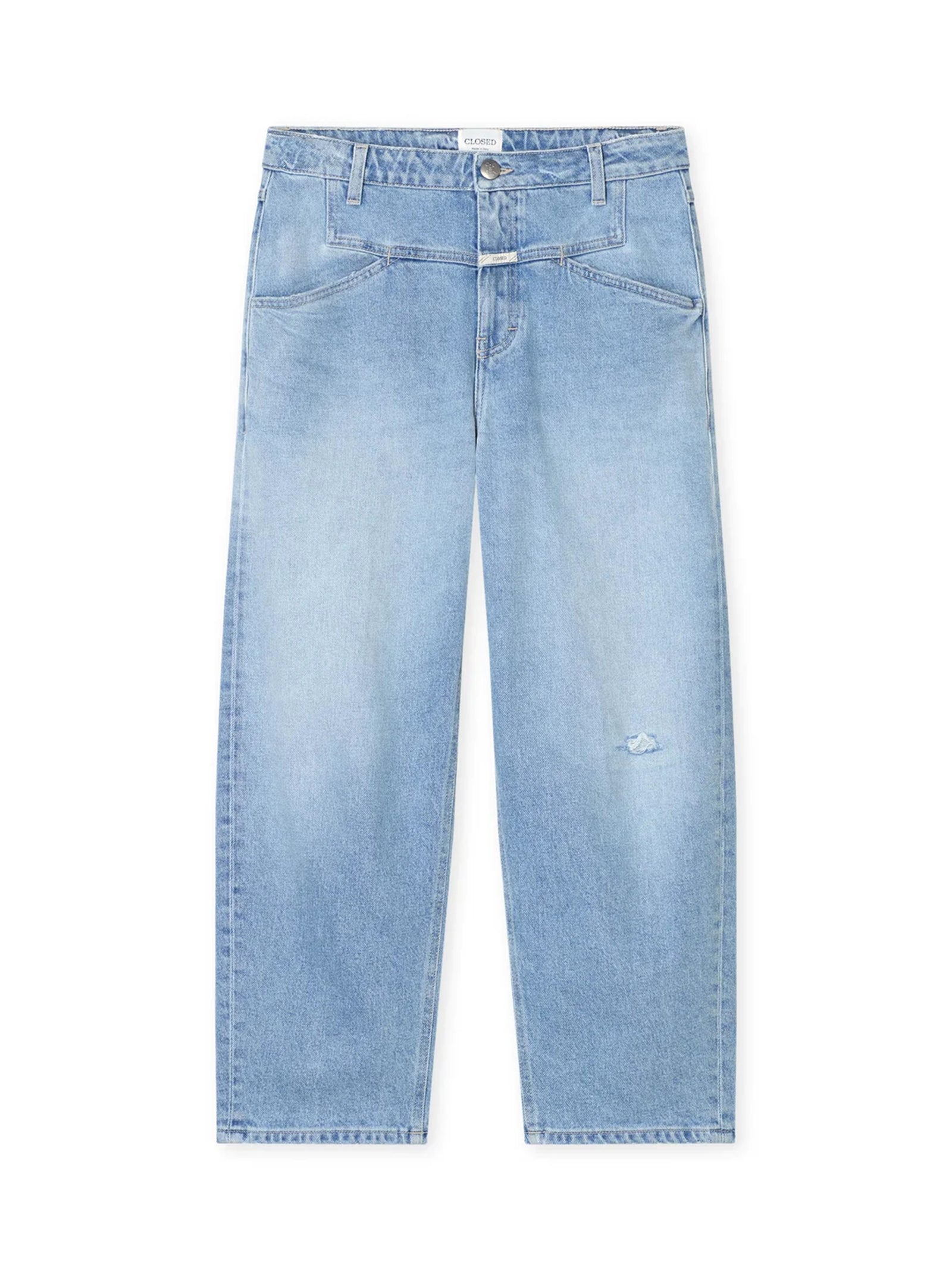Jeans dalla vestibilità rilassata con vita media e lunghezza accorciata, dotati di X-Pockets iconiche. Realizzati in denim elasticizzato con lavaggio vintage e dettaglio di riparazione artigianale sul ginocchio, prodotti in Italia.