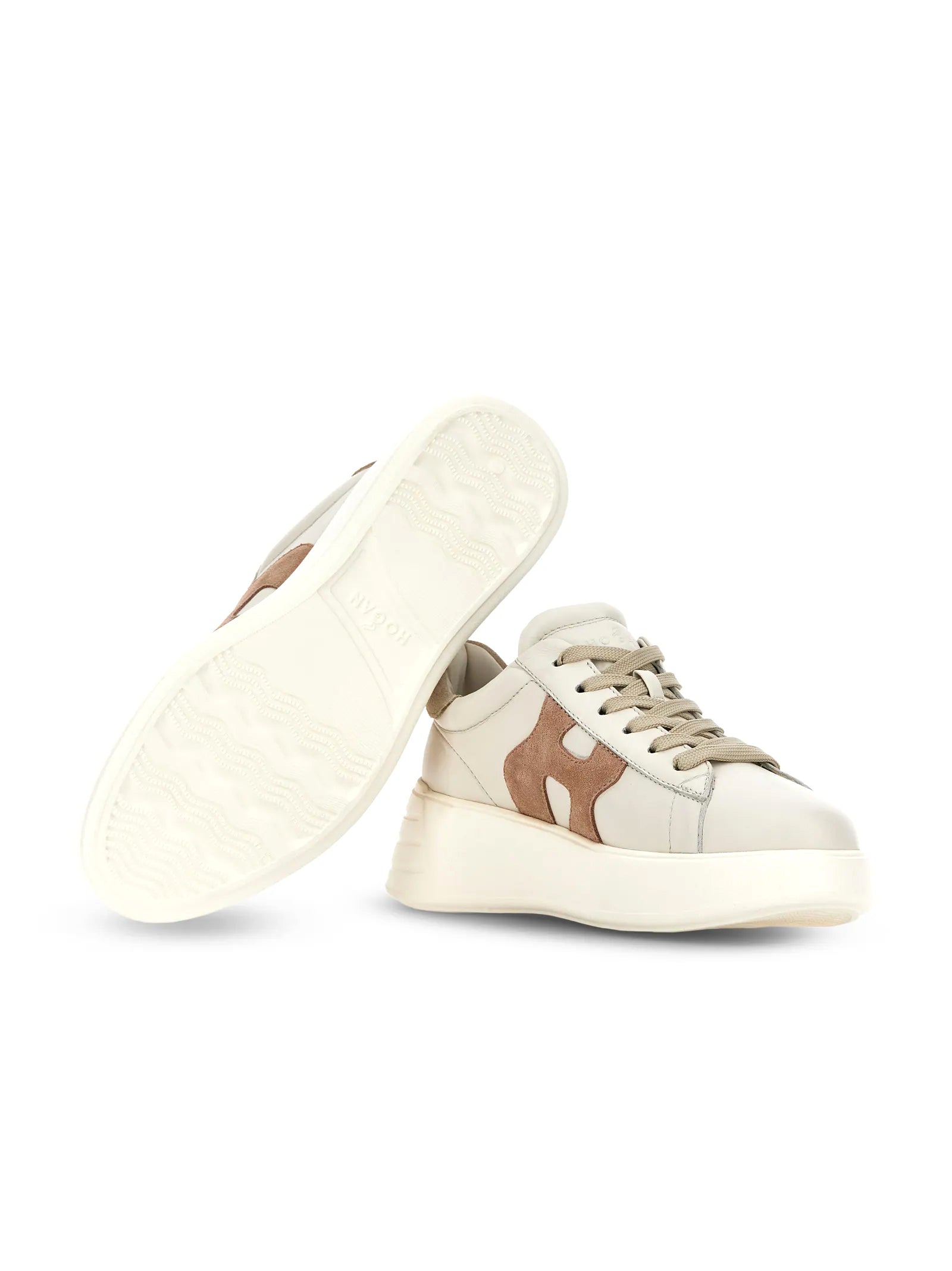 Sneakers Hogan Rebel da donna Made in Italy, con tomaia in nappa e H laterale in pelle scamosciata. Soletta in memory foam e suola in gomma, altezza totale 5 cm.