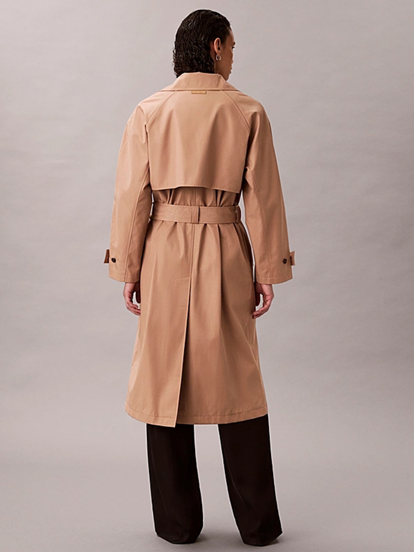 Trench dal taglio relaxed e lunghezza midi, con cintura da annodare in vita, doppia abbottonatura frontale, tasche oblique, aletta antivento, spacco singolo sul retro e mezza fodera.